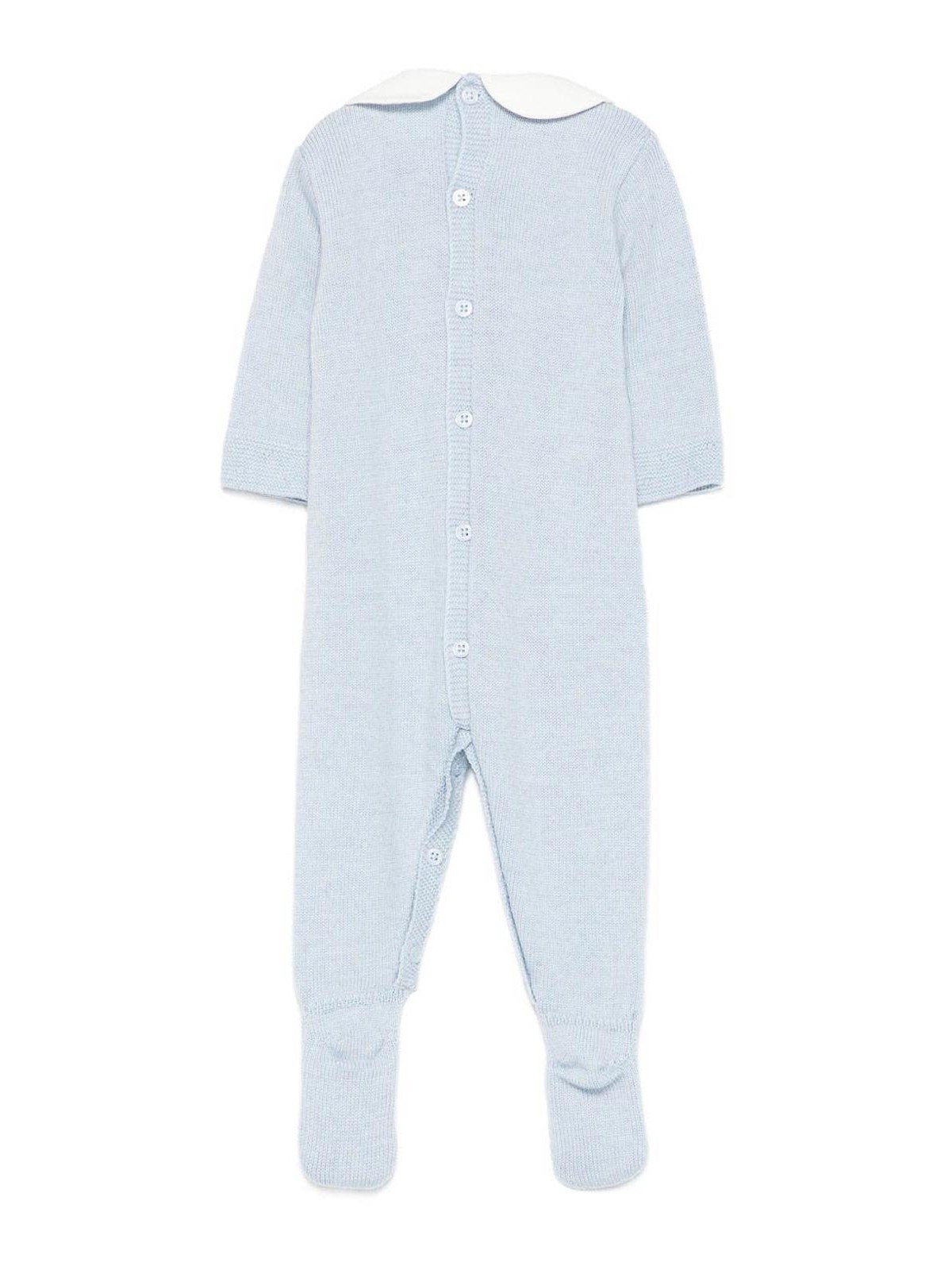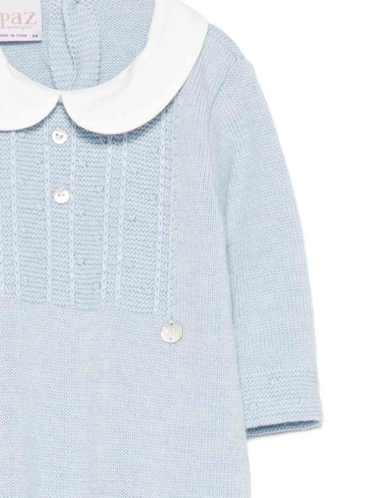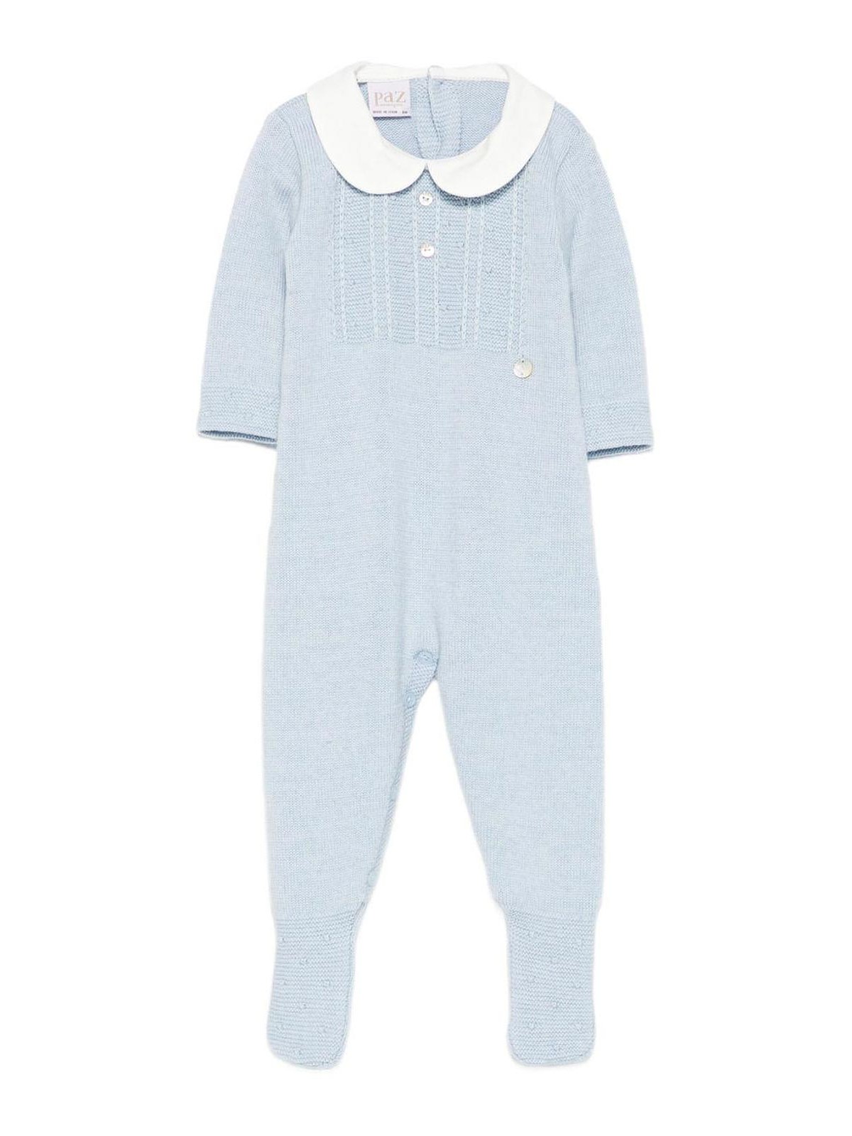 El mono con cuello peter pan presenta un cuello peter pan azul claro con botones, puños acanalados bordados en malla tejida