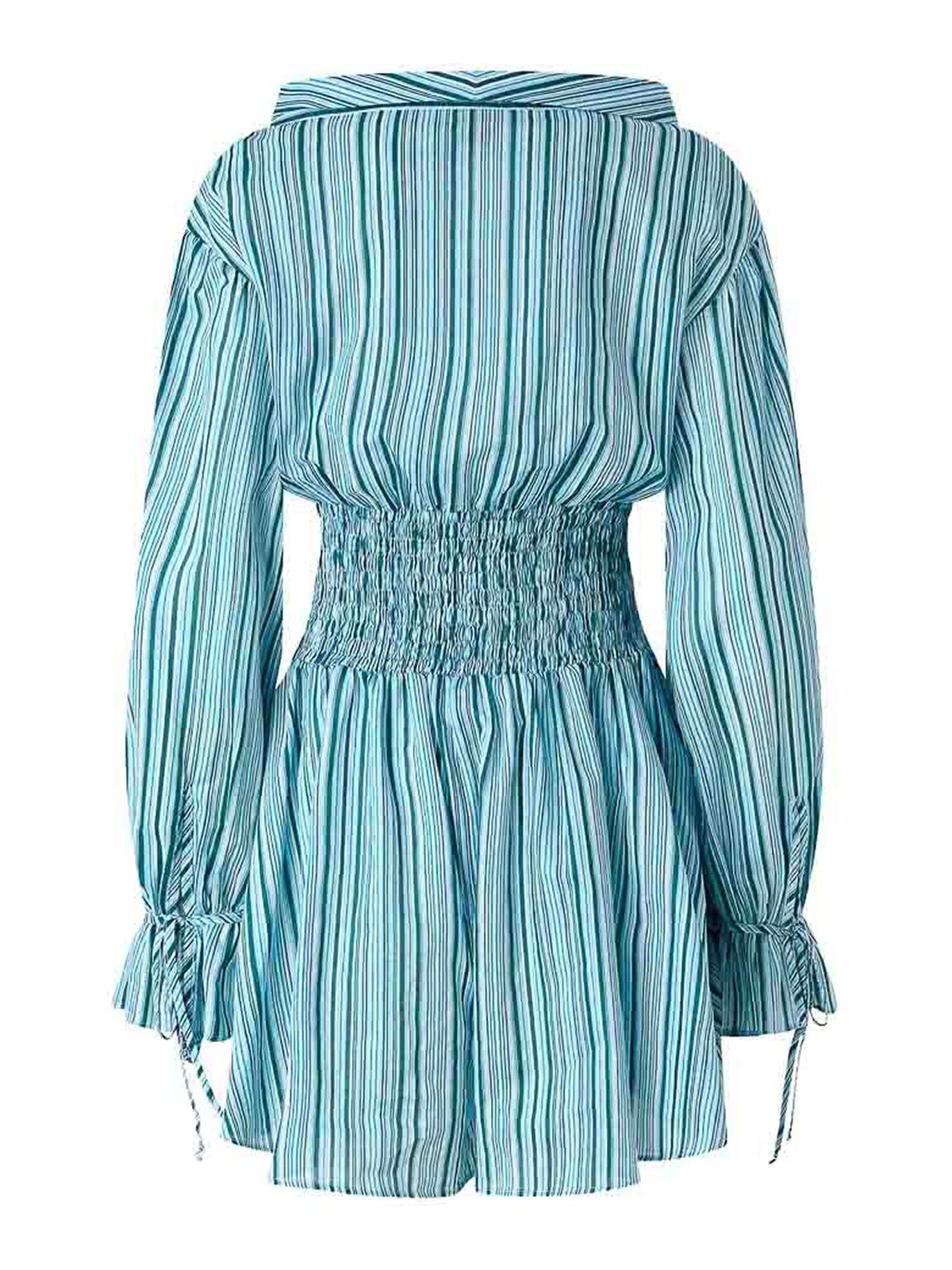 Estampado de rayas azul claro, cierre con botones, cintura fruncida, mangas largas, puños anudados
