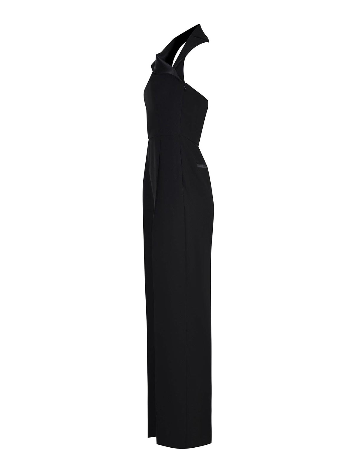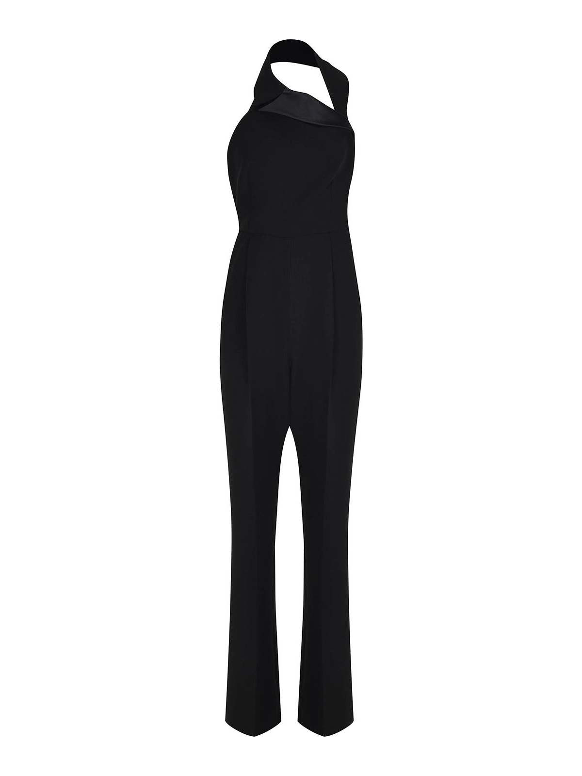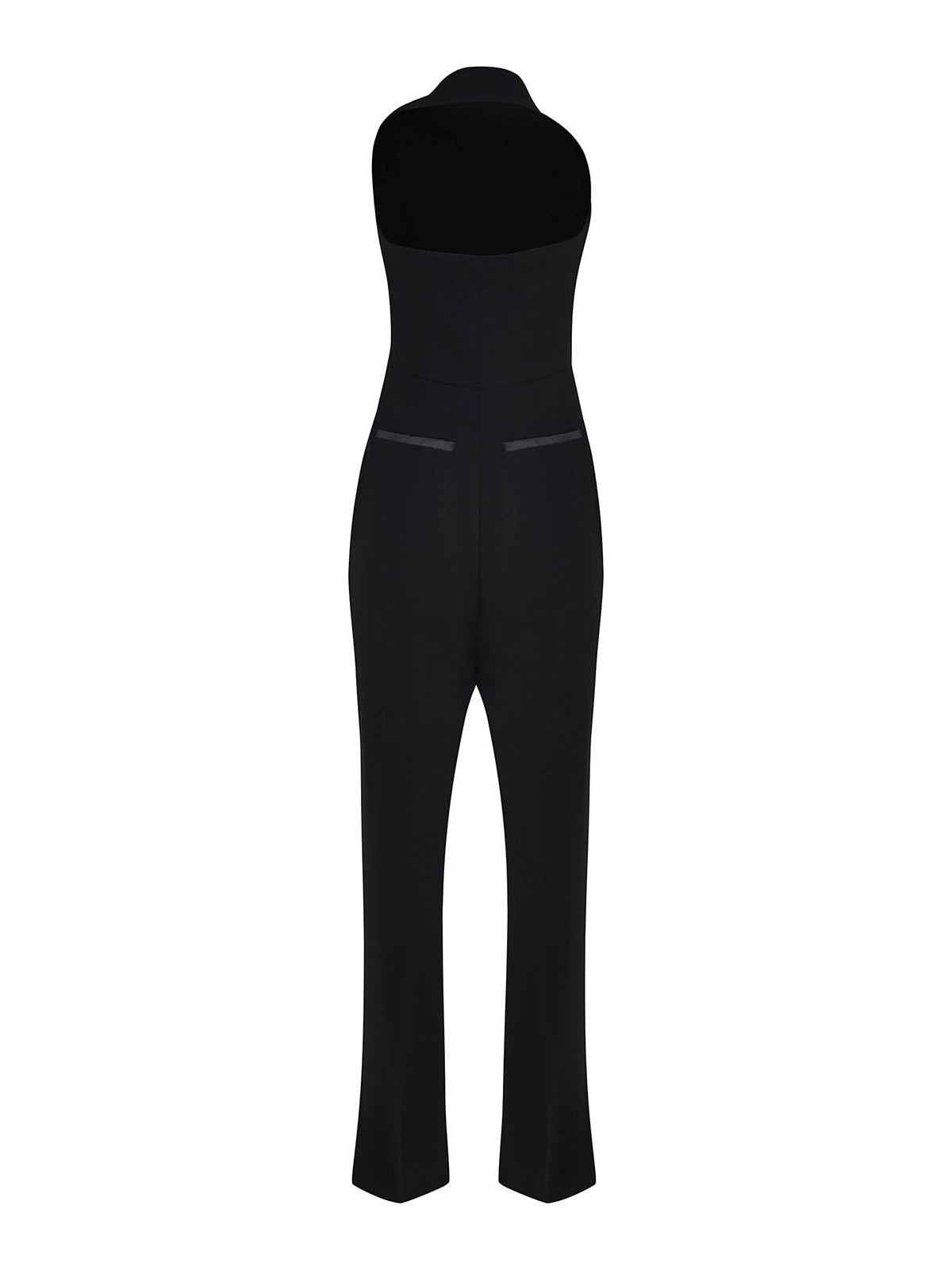 Mono max mara mxefagiani confeccionado en poliéster negro, sin mangas, escote halter, cuello con muescas doblado hacia el hombro izquierdo, pantalones plisados en la parte delantera, cierre con cremallera lateral, bolsillos laterales, bolsillos ribeteados en la parte posterior, ribete de satén tono sobre tono en el cuello y los bolsillos, semilingrado, 65% triacetato, 35% poliéster fabricado en Italia