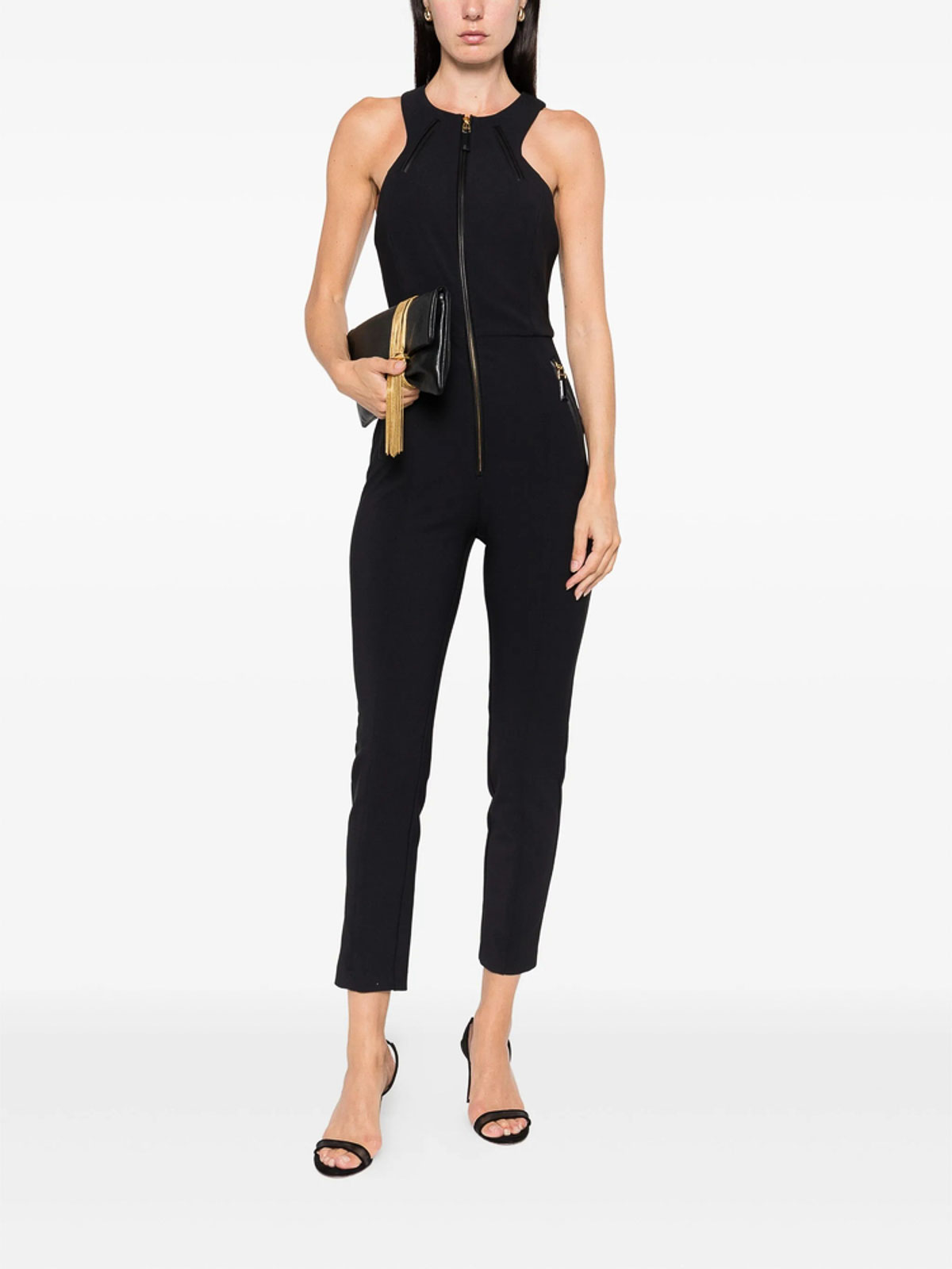 Cuello halter con cremallera negra, bolsillos laterales con cremallera en tono, silueta ajustada