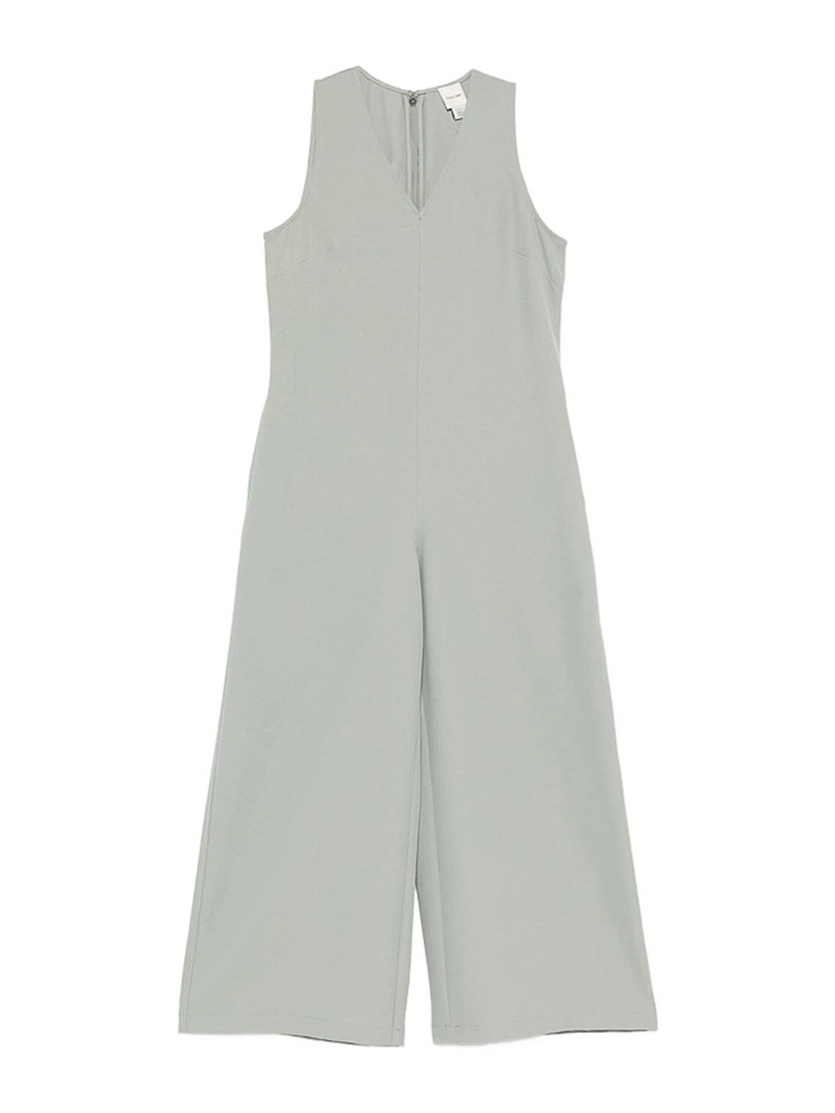 Cuello en V verde claro, cierre con cremallera, pernera ancha, sin mangas