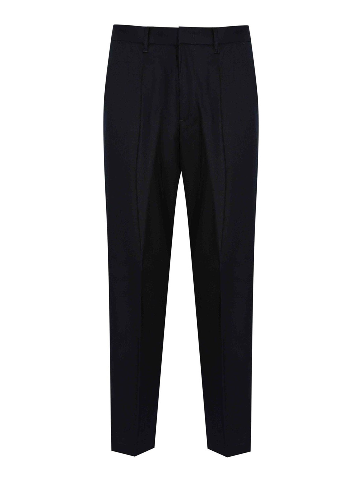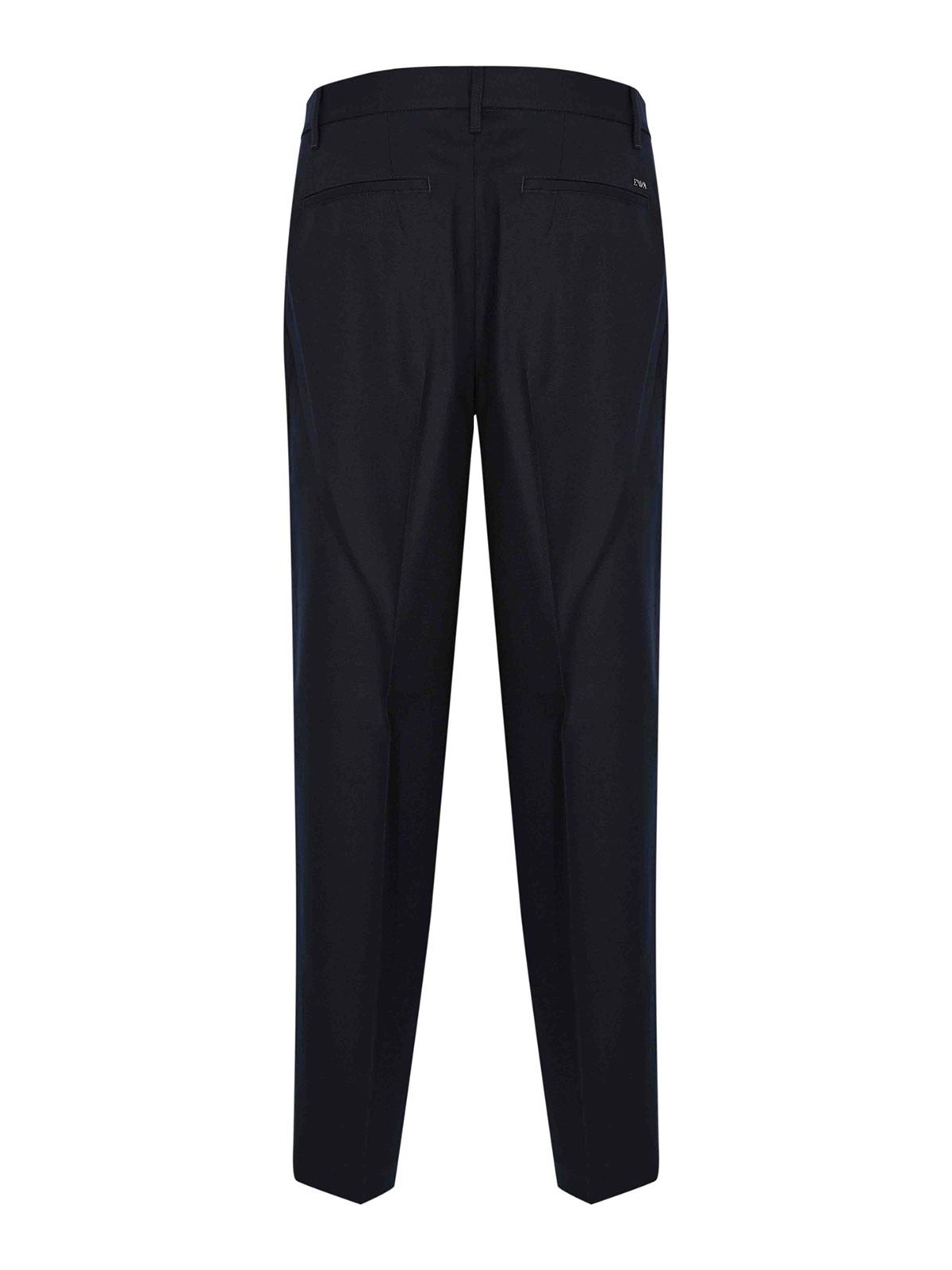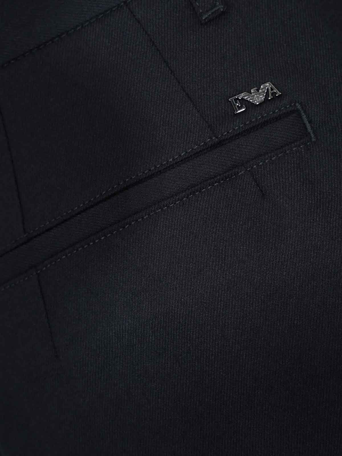 Pantalones de sarga elástica emporio armani con estampado de sarga elástica, lisos, cintura media con trabillas para el cinturón, bolsillos con botones y cremallera cubiertos, bolsillos laterales inclinados y bolsillos traseros ribeteados, longitud larga, pliegues planchados en la clásica silueta recta y ajustada, logotipo en la parte posterior, confección a medida con un poco elástico para mayor comodidad, forrados, sin ajuste