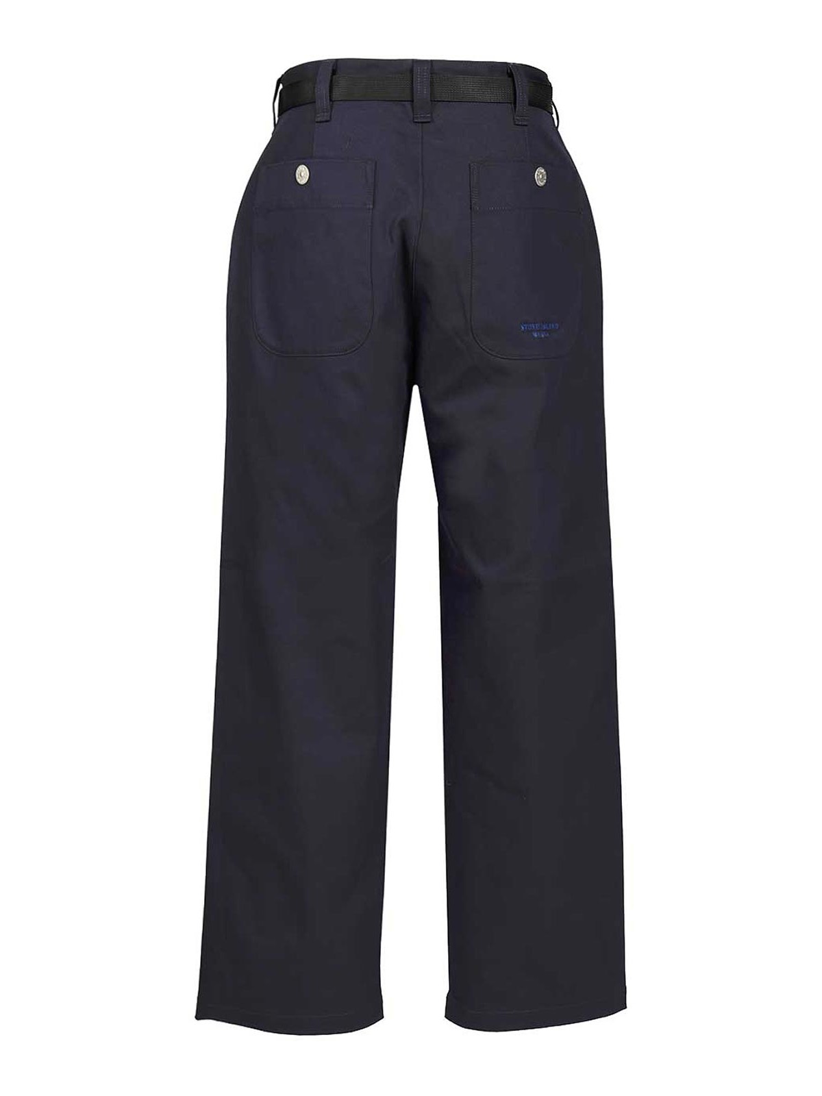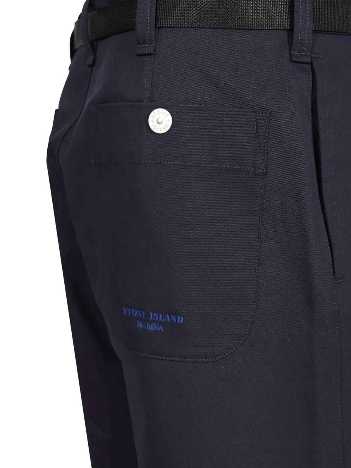 Bolsillos verticales, dos bolsillos de parche con botones a presión en la parte posterior, letras de Stone Island Marina bordadas en el bolsillo derecho, dardos individuales en la solapa con botón oculto y cincha a presión, cinturón con hebilla en G, corte holgado