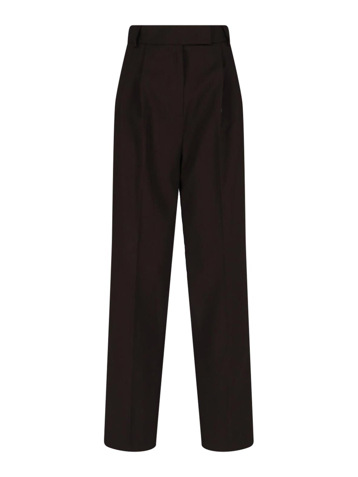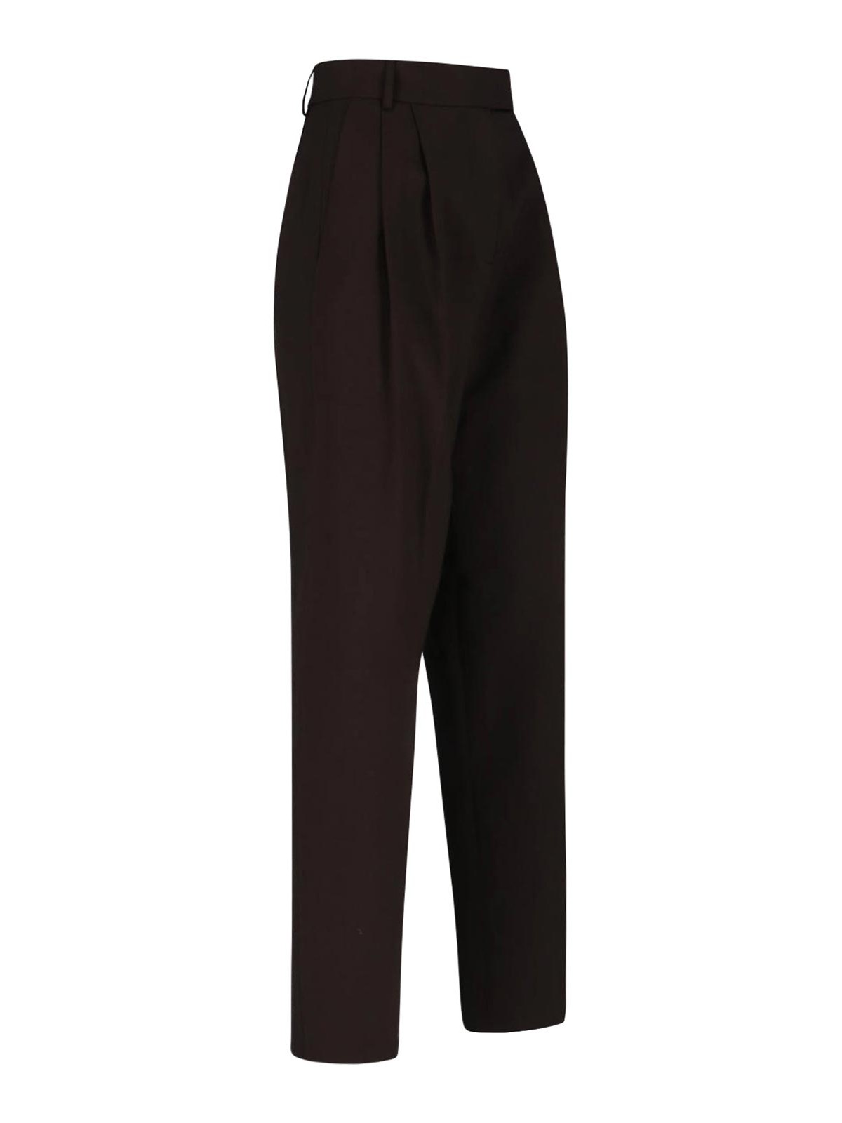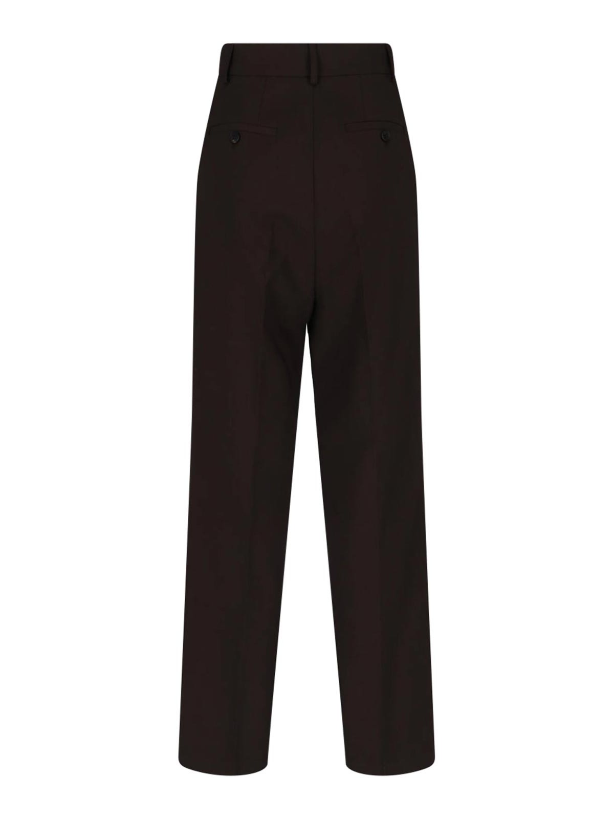 Pantalones rectos de frankie shop, en tela marrón, tono oscuro, cintura media, trabillas, cierre de velcro y cremallera, pliegues en la parte delantera, dos bolsillos laterales, dos bolsillos ribeteados con botones en la parte trasera, pernera recta.