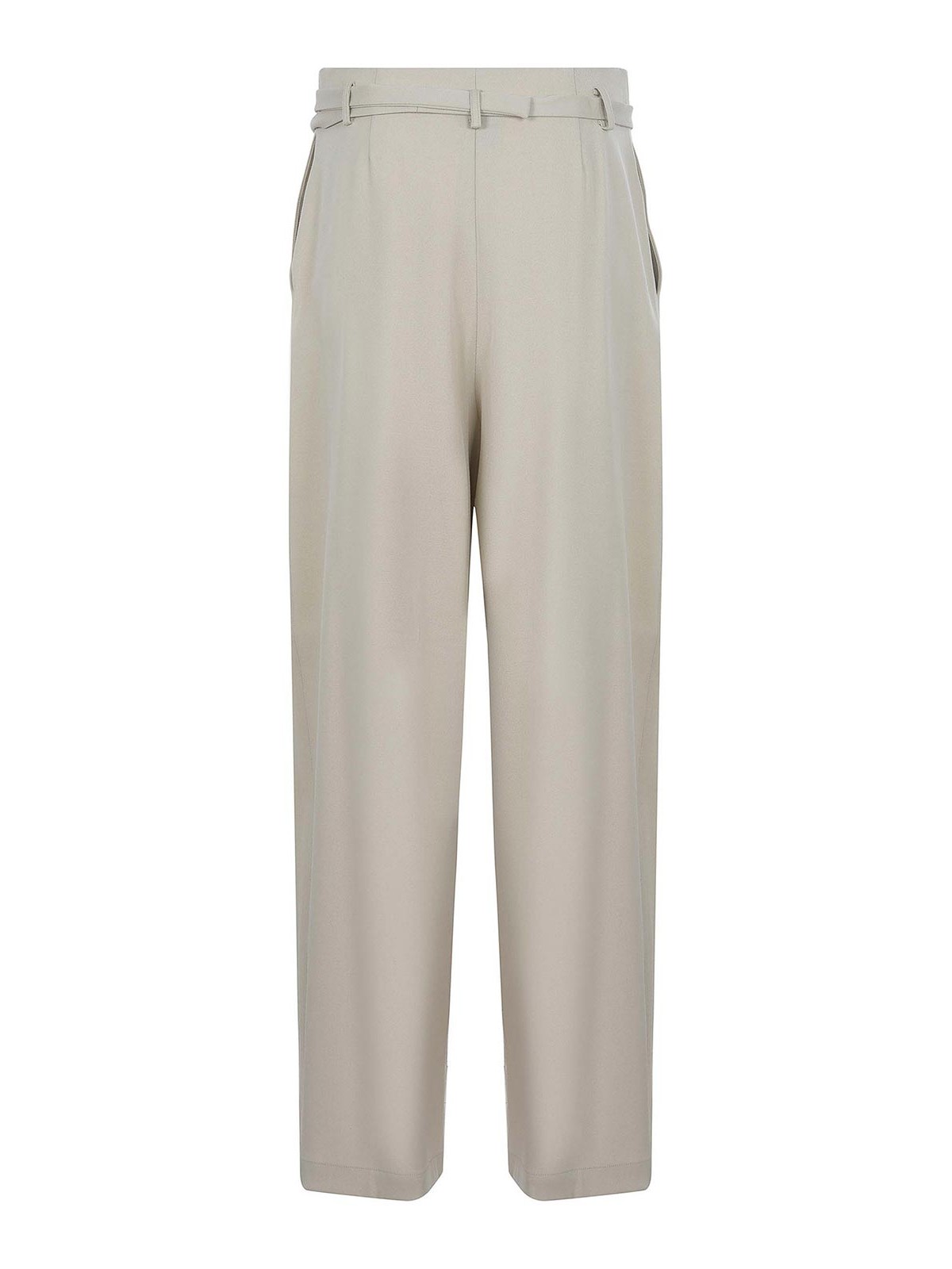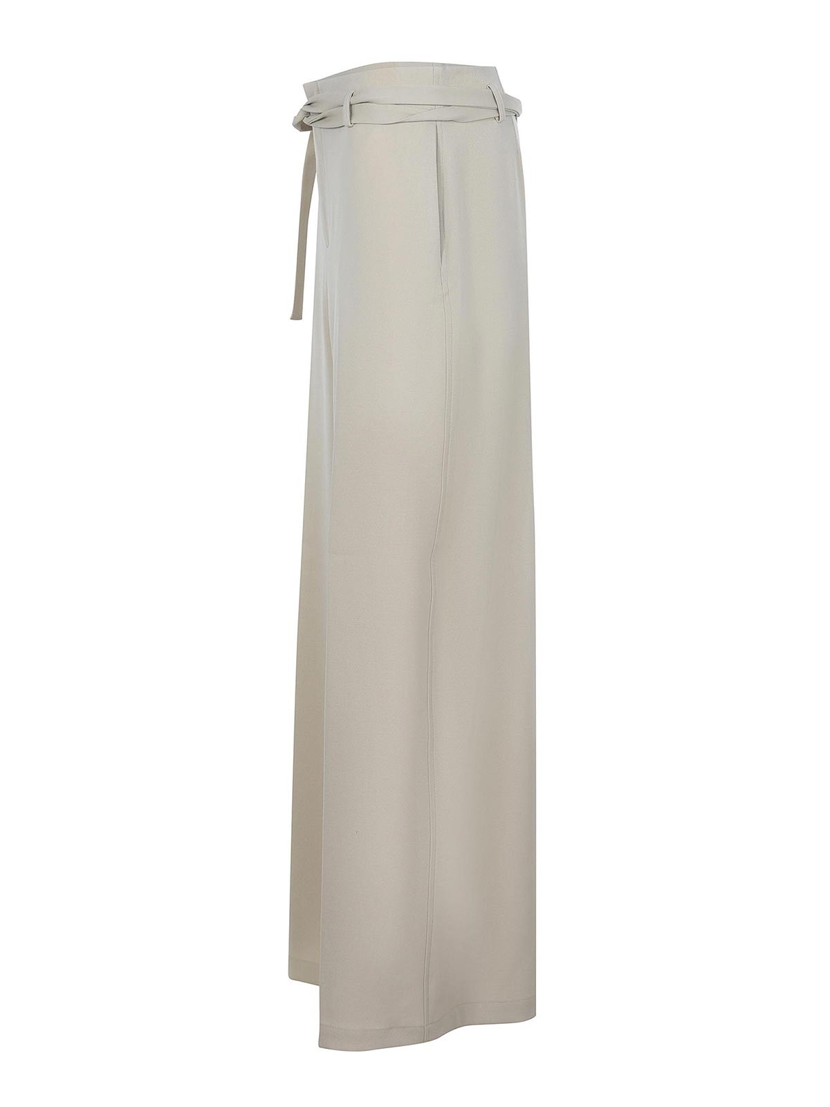 Pantalones Alysi de lana de color masilla, trabillas para el cinturón, cordón ajustable en la cintura, cierre frontal con botón de gancho y cremallera, bolsillos laterales, pernera ancha. 100% lana virgen. Hecho en Italia.