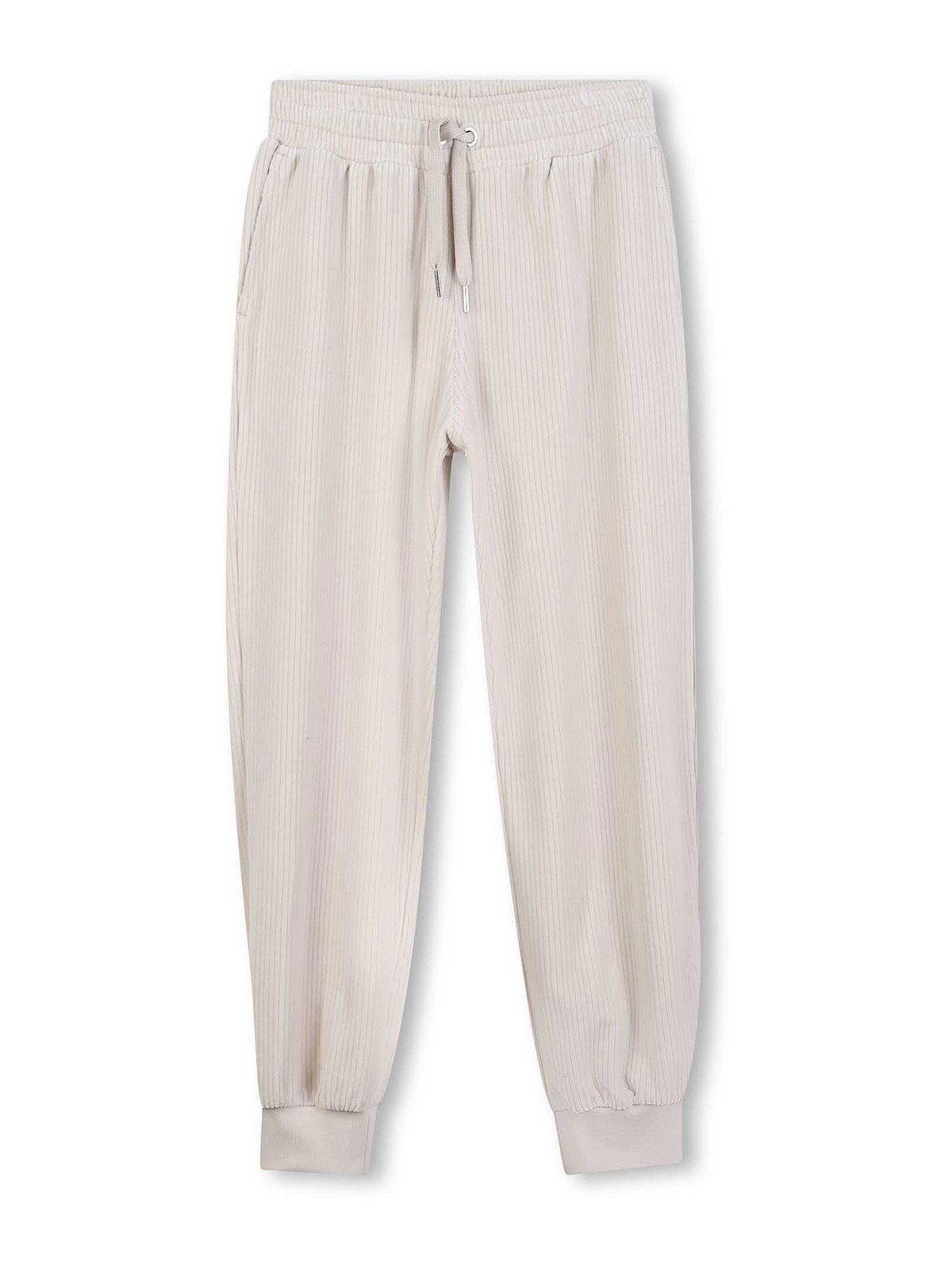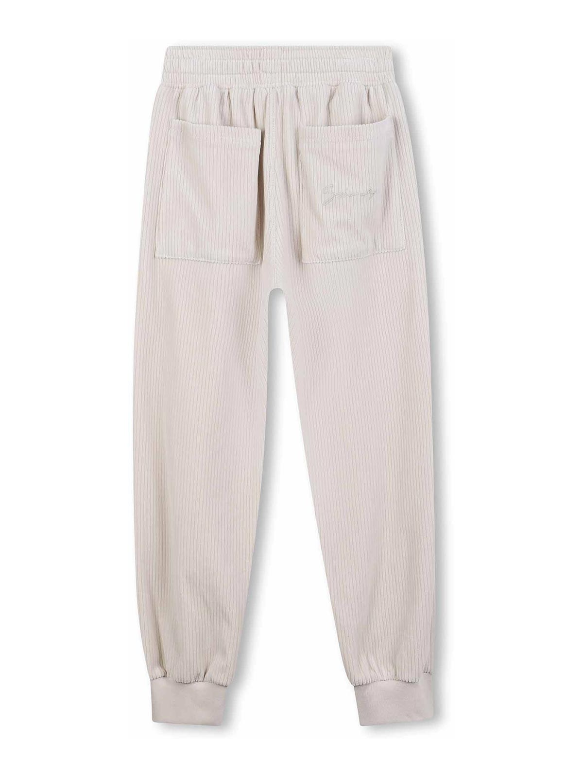 Pantalones con logotipo acanalado de color beige, cintura elástica, cierre con cordón, puños cónicos, bolsillos frontales