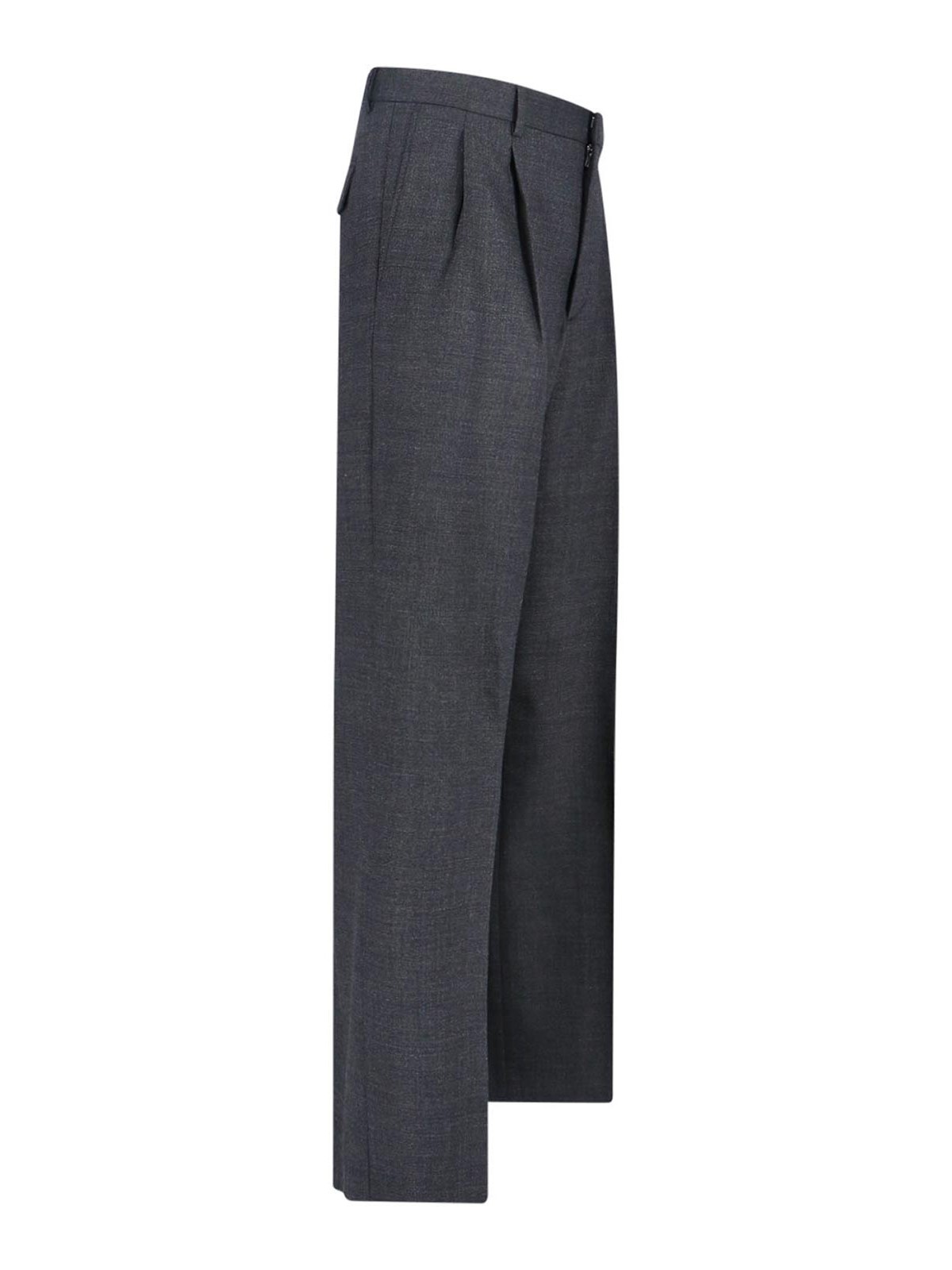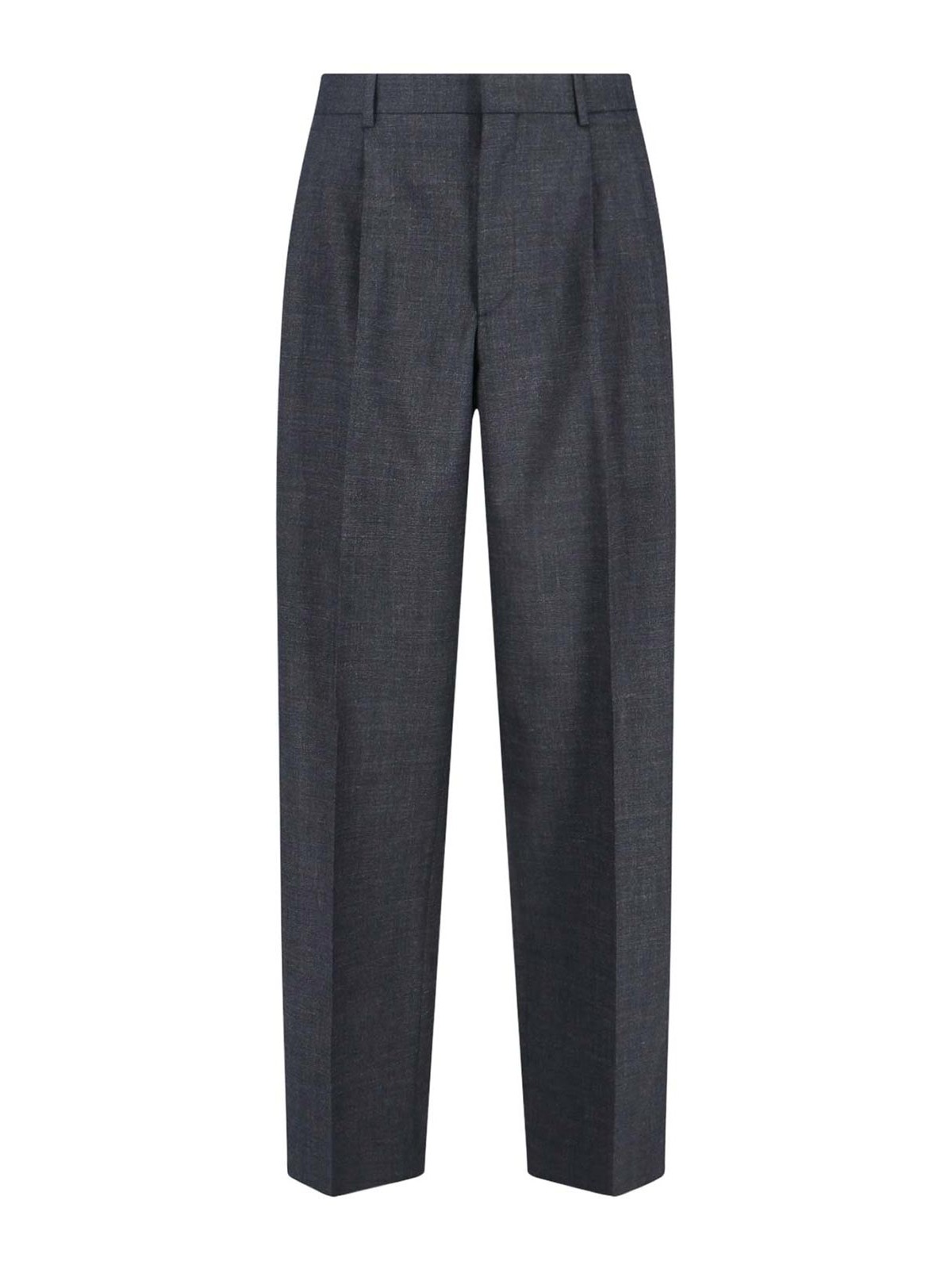 Pantalones anchos en forma de girasol, en mezcla de lana virgen marrón, cintura media, trabillas, cierre de velcro y cremallera, pliegues en la parte delantera, dos bolsillos laterales, dos bolsillos traseros, pernera recta.