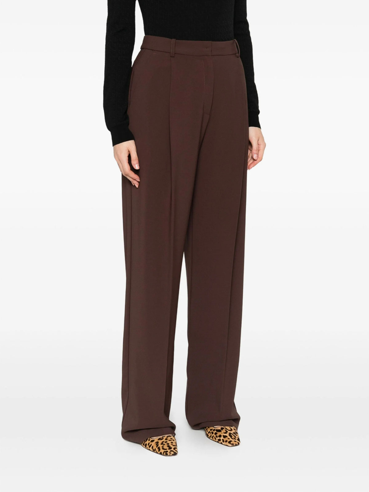 Bolsillos laterales plisados de color marrón café, pierna recta, cintura media, bragueta con cremallera oculta