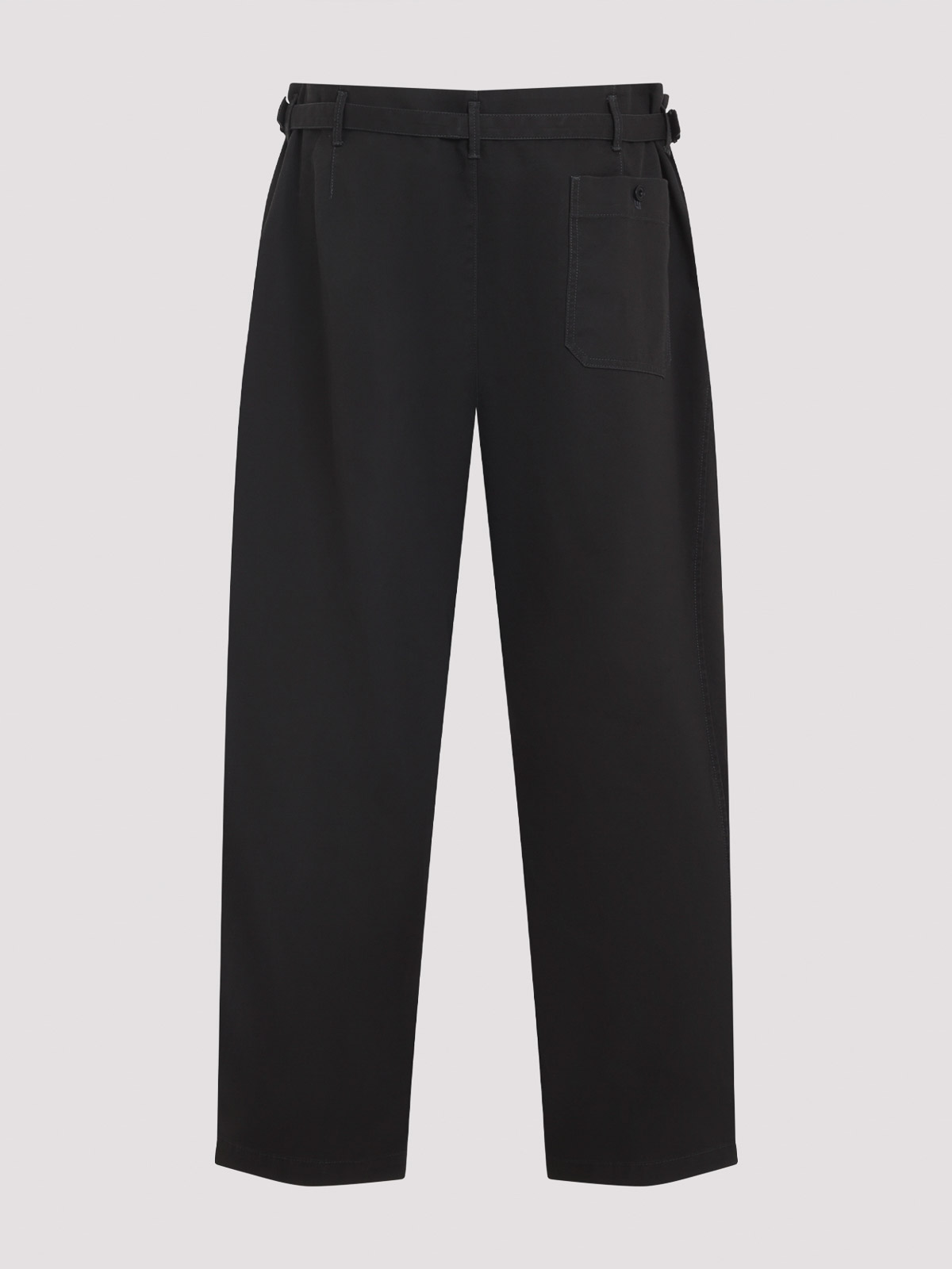 Pantalones Lemaire de color marrón zanahoria, pantalones de color marrón espresso puro, ocultan cremallera, trabillas para el cinturón, bolsillos laterales, bolsillos laterales, bolsillos con botones en la espalda, cinturón tonal ajustable, pernera ancha, dobladillo recto, costuras tonales