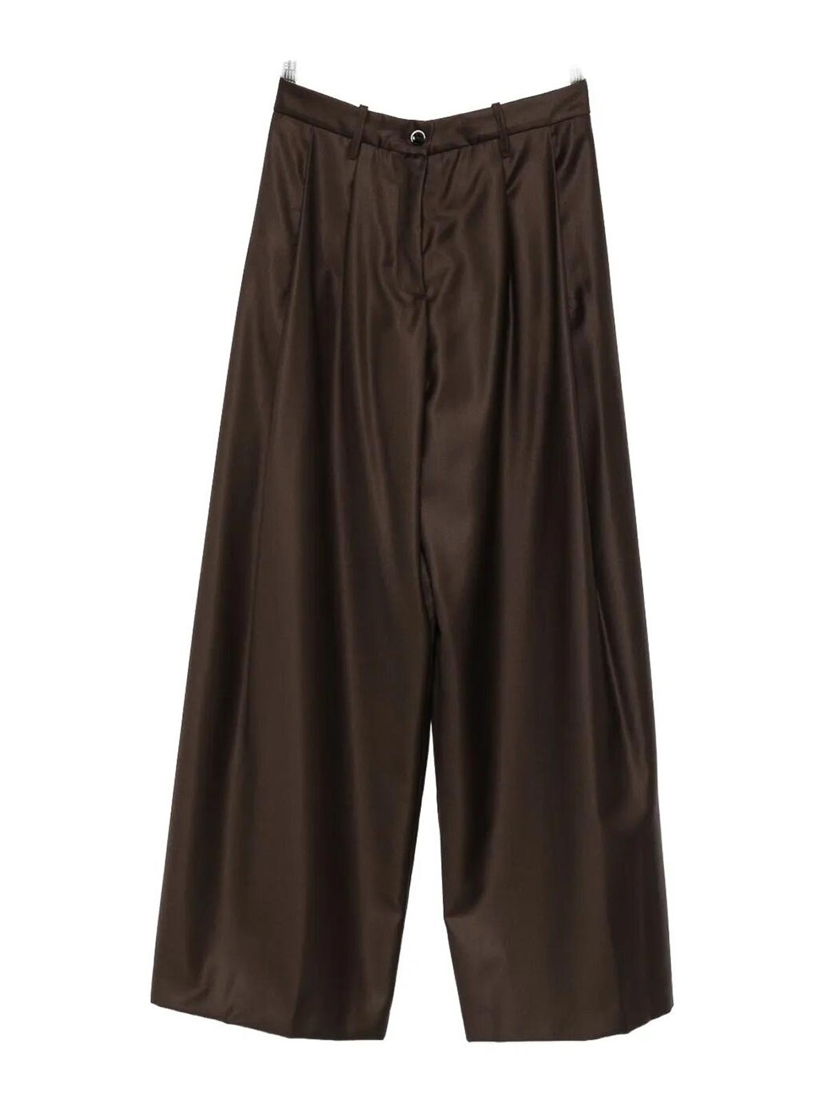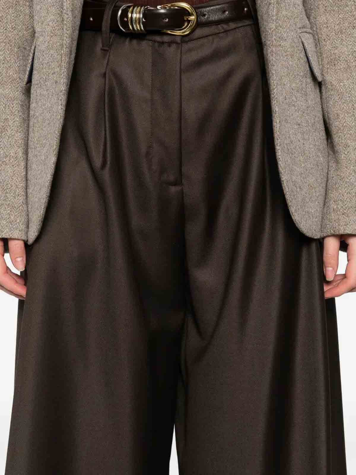 Pantalones de lana y seda marrones a las nueve de la mañana, corte alto que moldea la cintura y las caderas antes de transformarse en una pernera ancha y cómoda, con cierre de cremallera y botón.