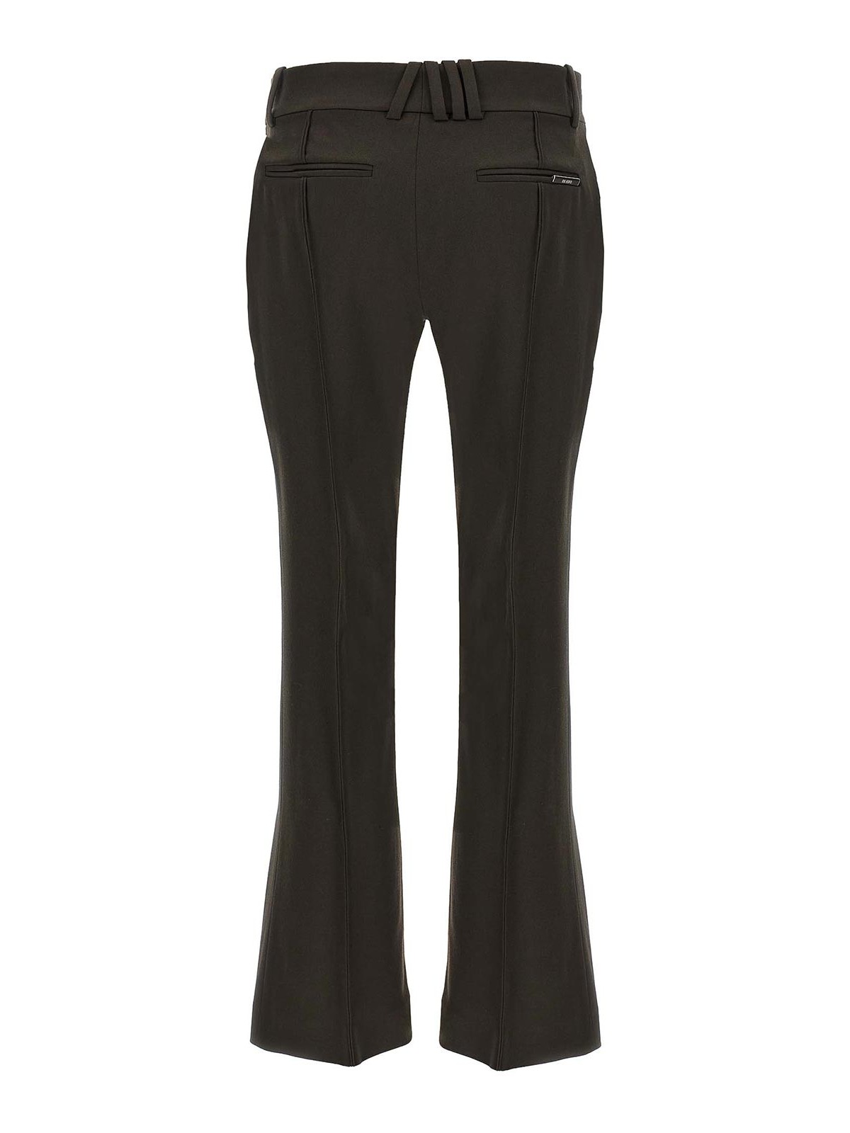 Pantalón de gabardina de lana elástica, modelo corto con pernera acampanada, cierre con costuras y cremallera, cierre con ganchos y botones en la parte delantera, bolsillos.