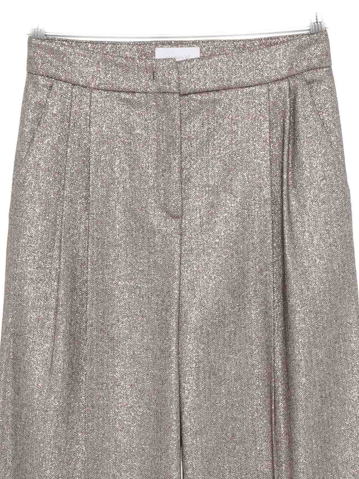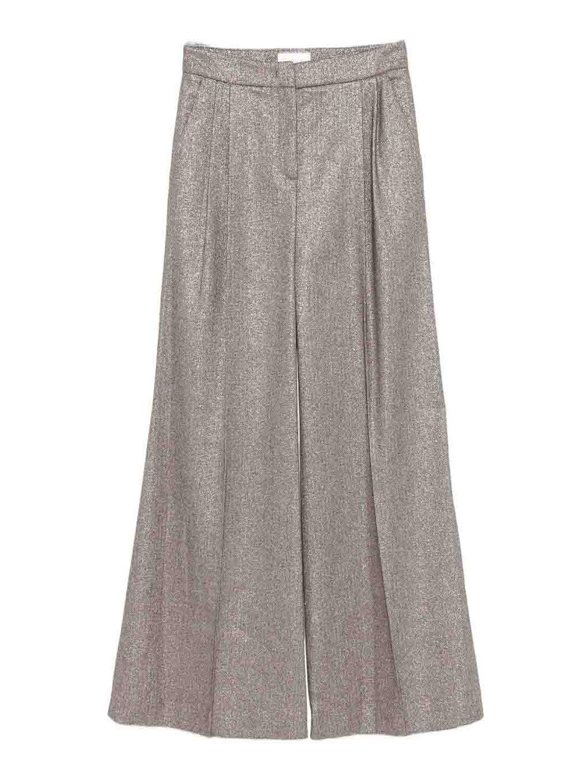 Detalles plisados en gris ceniza, pernera ancha, bolsillos laterales, mezcla de seda
