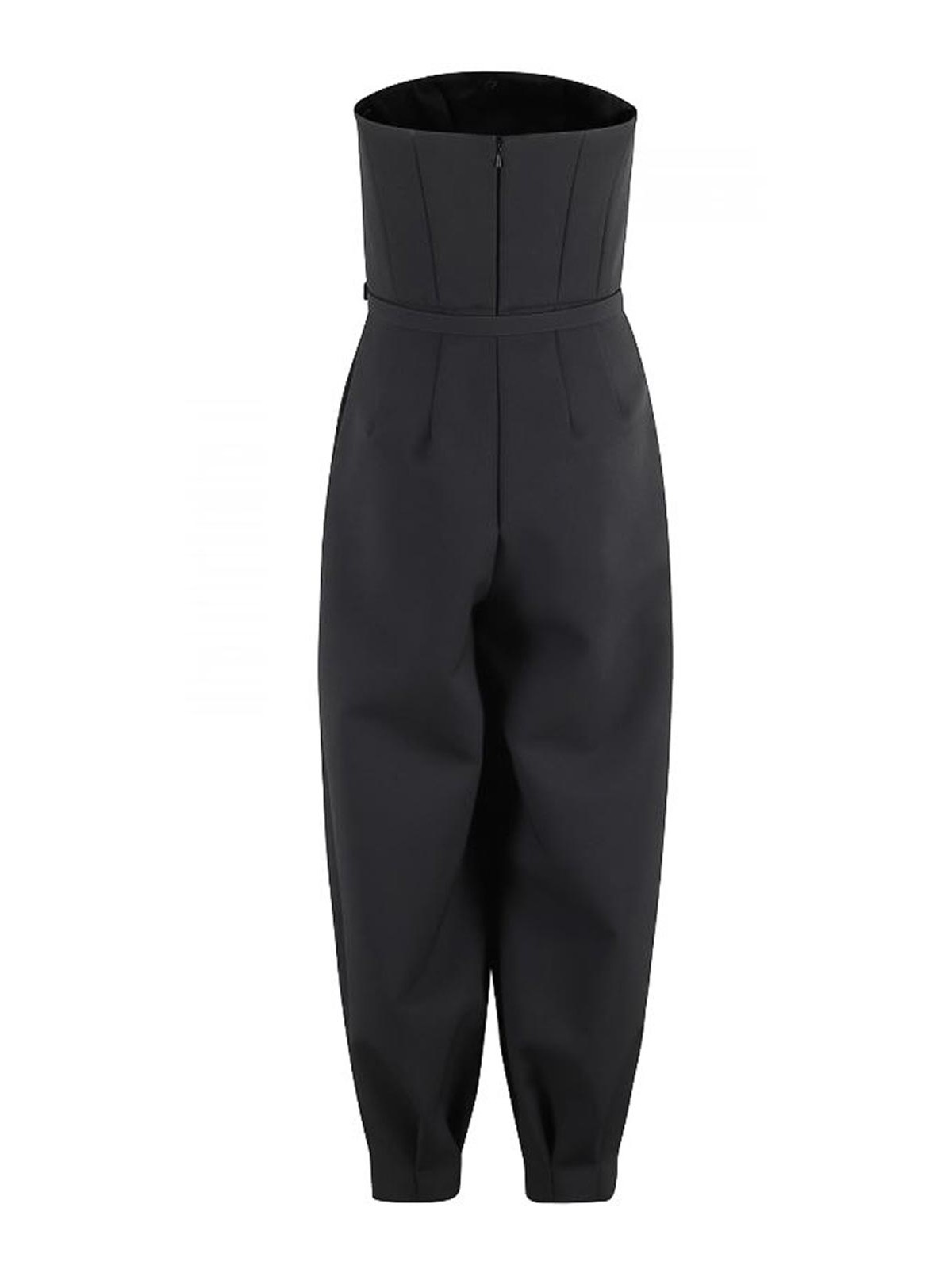 Mono estilo bustier en tejido técnico negro, con deshuesado. Bolsillos laterales, corpiño ajustado, pantalones con pliegues, cónicos en el dobladillo. Cinturón extraíble