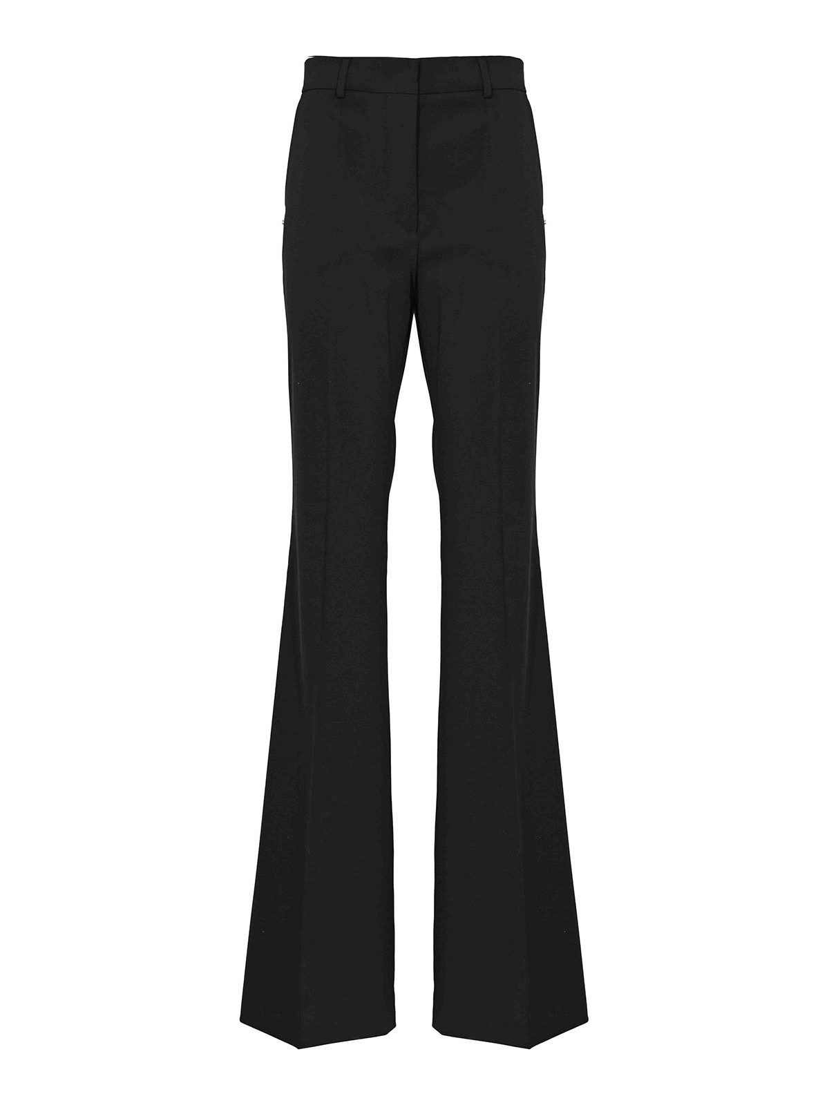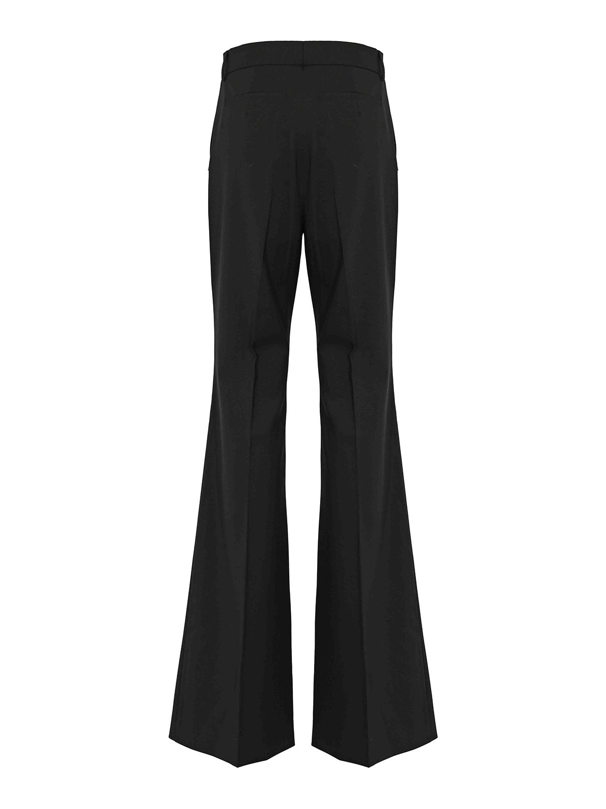 Pantalones elásticos acampanados modelo sportmax hangar, patrón elástico natural puro, liso, alto, cintura con trabillas, cremallera cubierta y gancho oculto en los bolsillos, bolsillos ribeteados laterales y bolsillos ribeteados en la parte trasera, largo plisado a lo largo de la pierna, dobladillo acampanado, confección limpia a medida, forrado sin ajuste, regular, ligeramente acampanado desde la rodilla