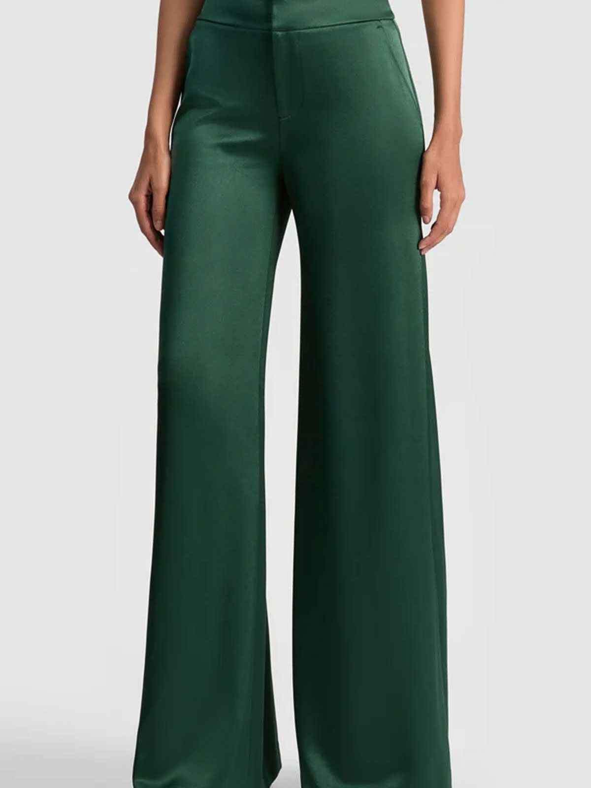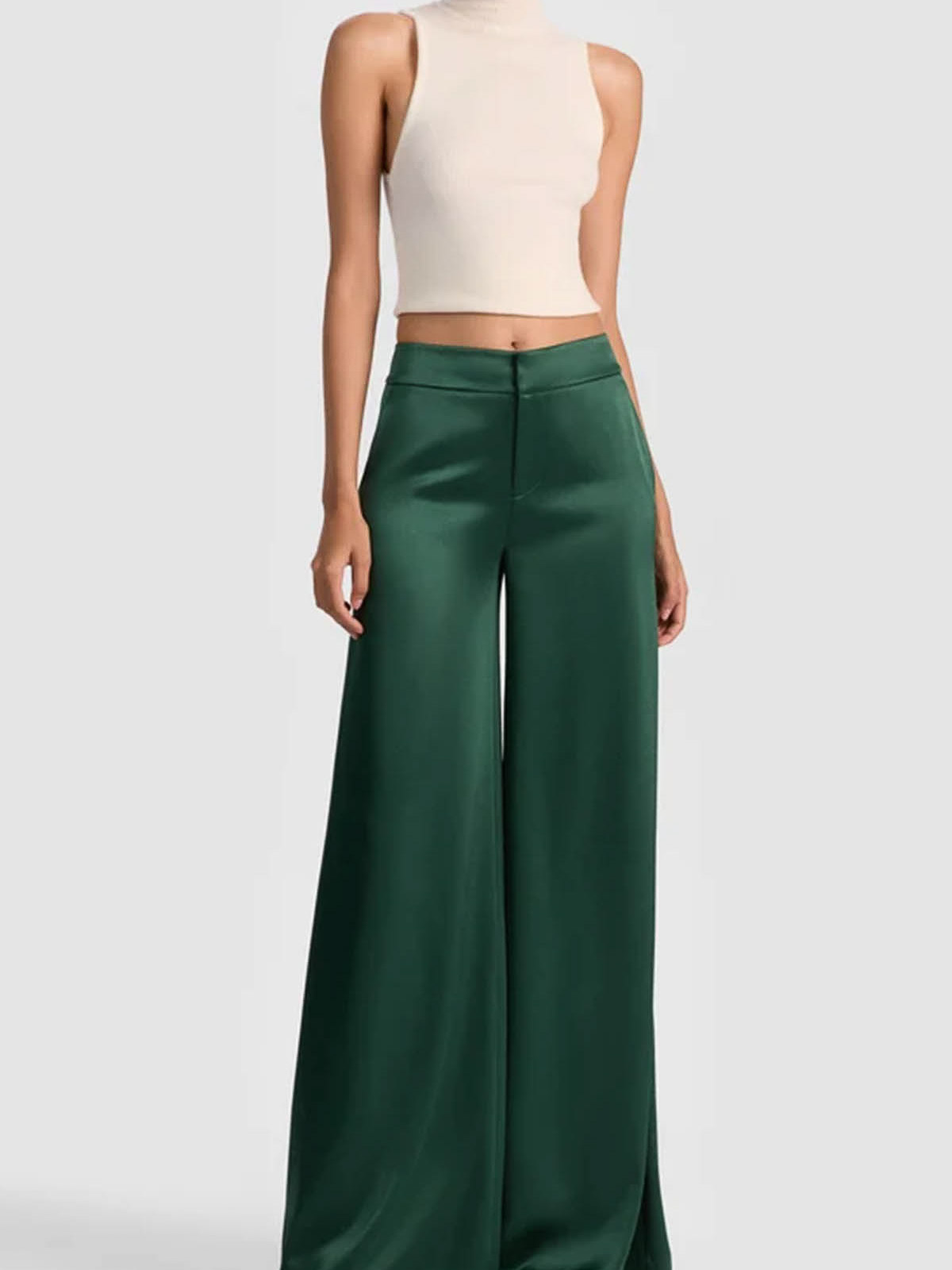 Talle alto, cierre frontal oculto con cremallera y gancho, bolsillos laterales ocultos, pernera ancha. composición 75% triacetato, 25% poliéster