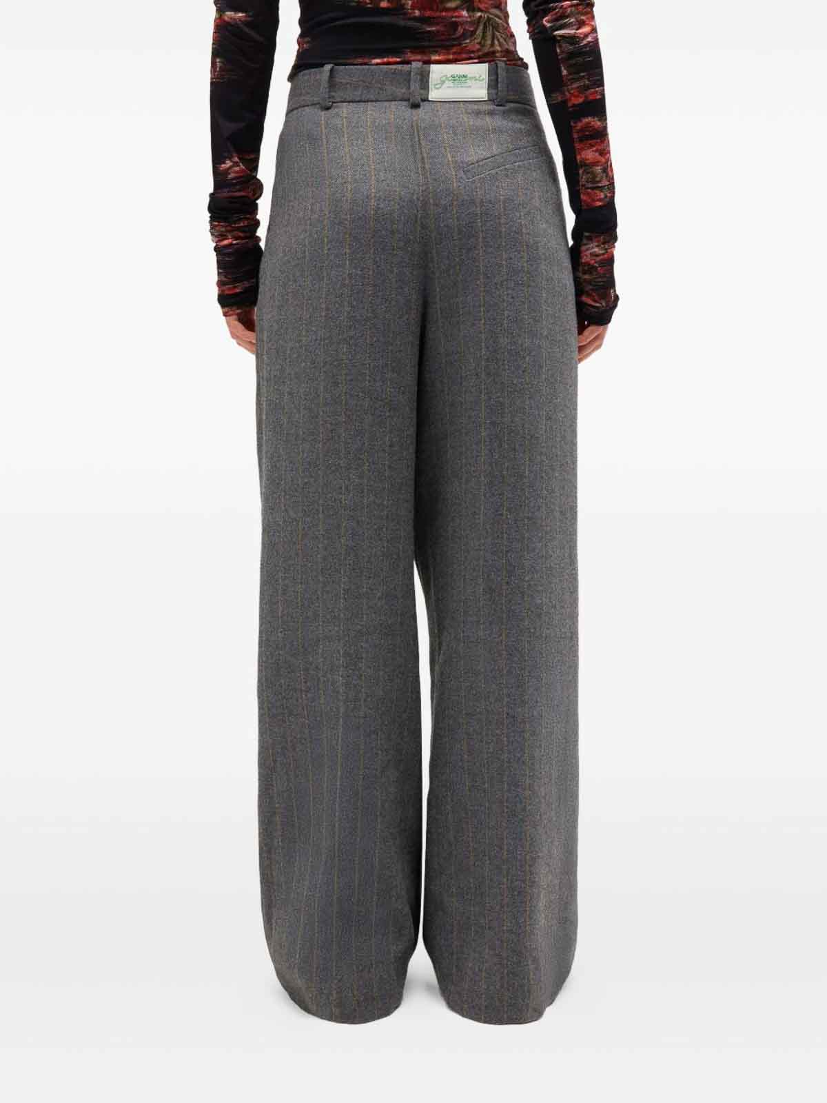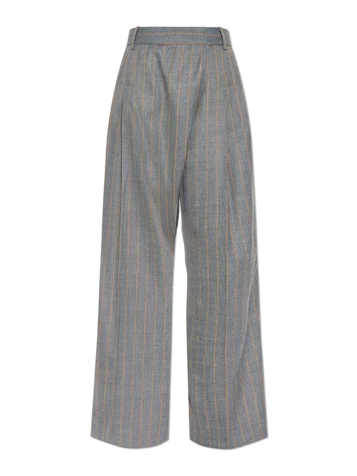 Pantalones grises a rayas de ganni con un diseño plisado y entallado, una pieza refinada y versátil, perfecta para crear looks elegantes y contemporáneos
