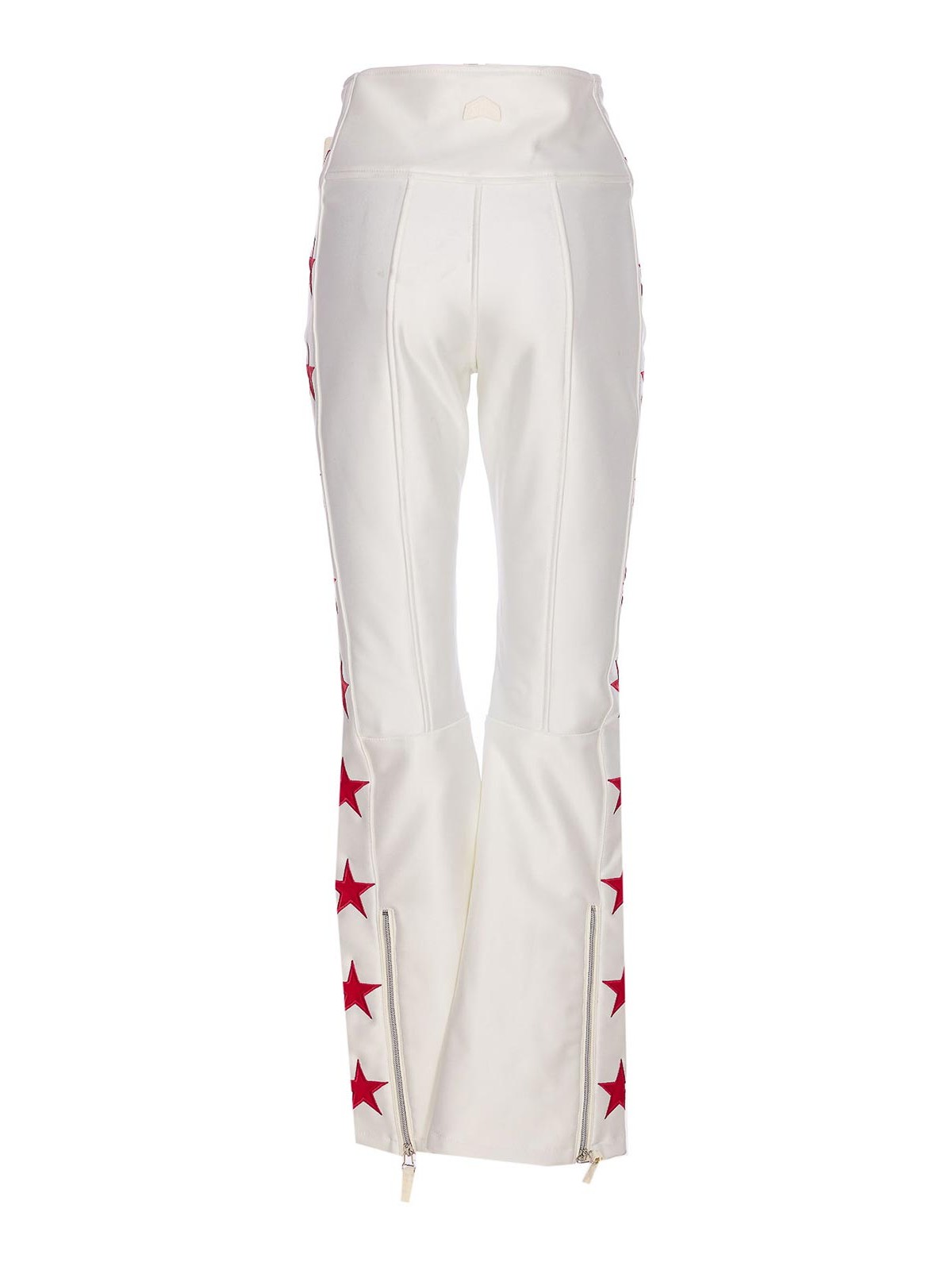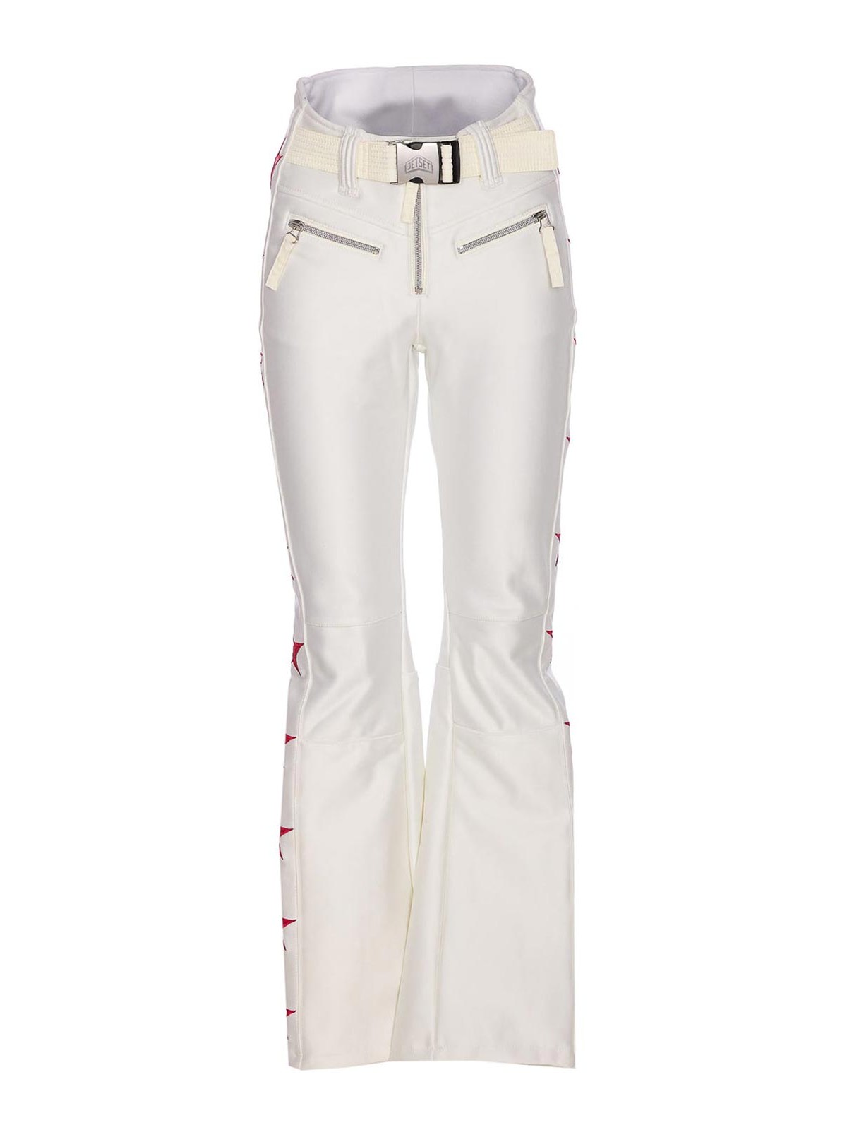 Pantalones de esquí tipo tiby blancos tipo jet set, cintura alta, logotipo de parche en la parte posterior, cierre con cremallera, cinturón en la cintura, banda lateral con detalles de estrellas bordadas, detalles de cremallera