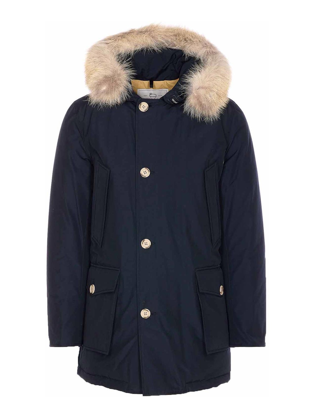 Parka Woolrich azul con cierre frontal con cremallera y botones, manga larga, cierre de velcro con el logotipo, detalle de pelo extraíble en la capucha, mangas largas, bolsillos, puños acolchados y elásticos