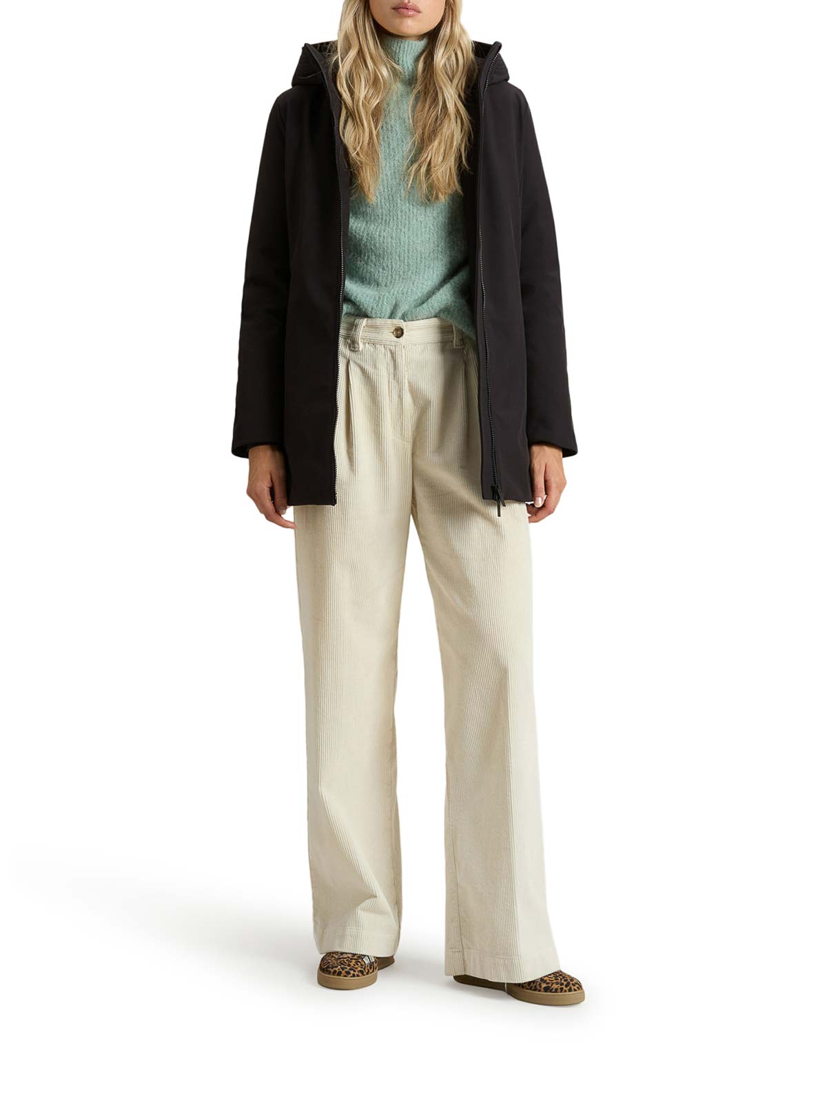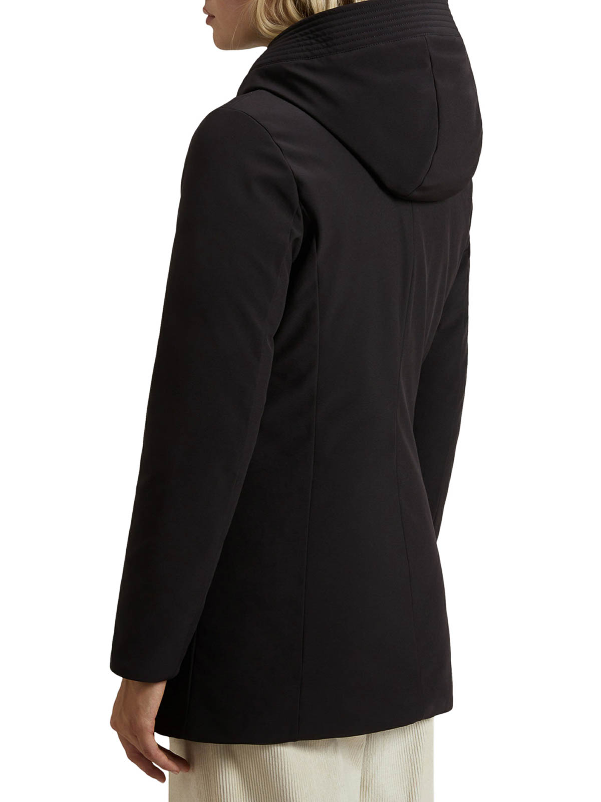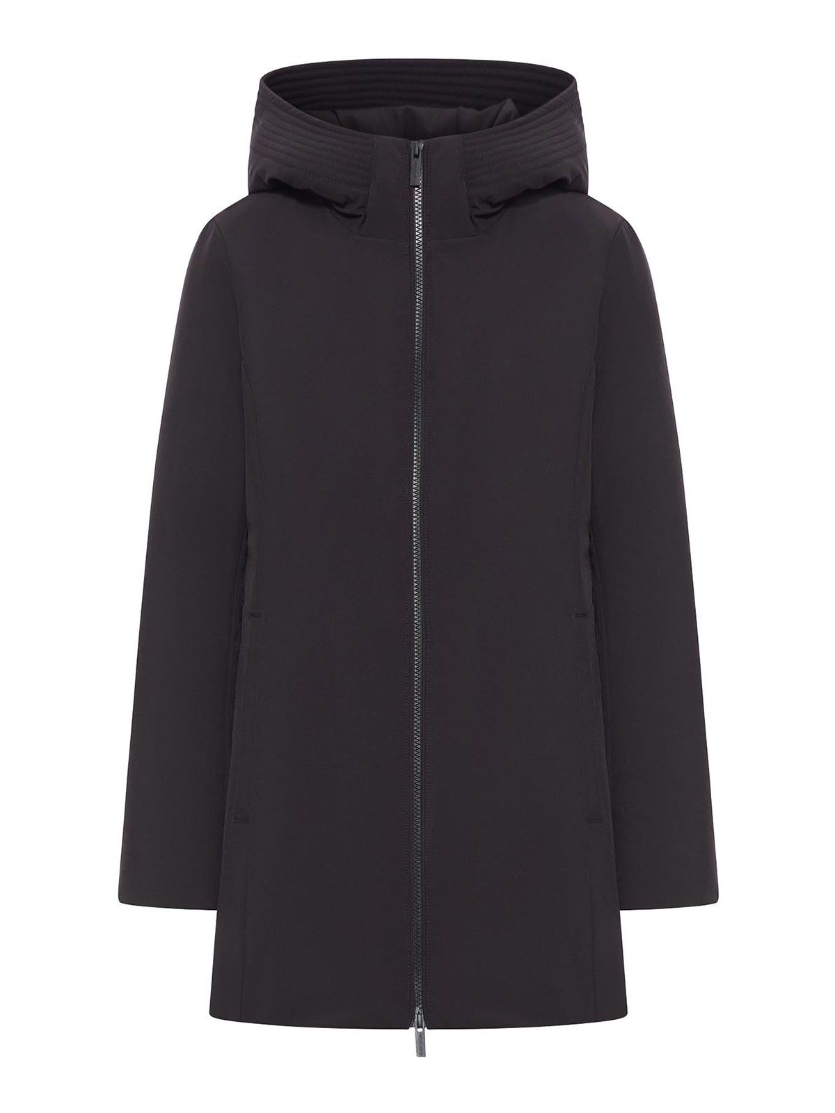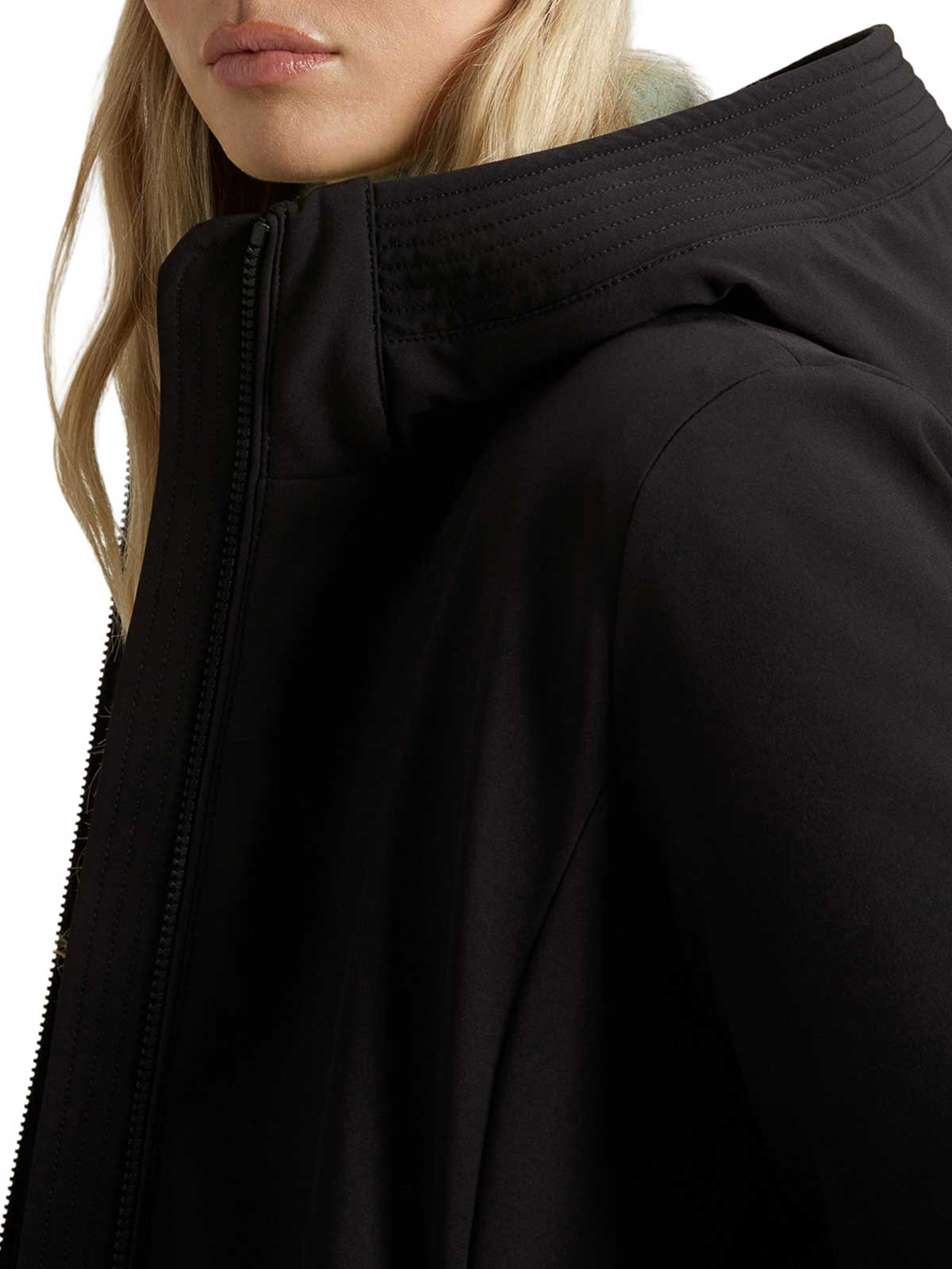Softshell, resistente al agua y al viento, relleno, certificado RDS por Control Union Cu, acolchado en forma de V, capucha, cuello alto, cremallera bidireccional, cintura con cordón, bolsillos laterales ribeteados con cremallera, bolsillo con cremallera, puños acanalados, etiqueta lateral, color negro Nombre del color del diseñador: negro