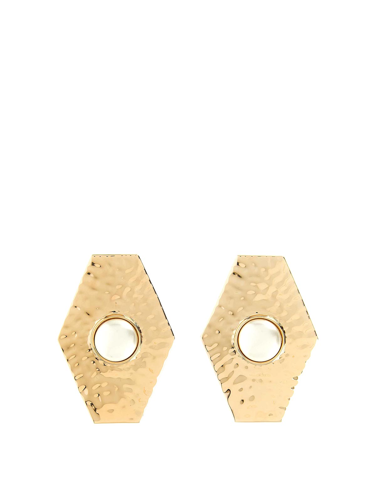pendientes grandes de metal martillado con perlas doradas martilladas con aplicación central de perlas, silueta geométrica y cierre giratorio. El artículo no se puede devolver