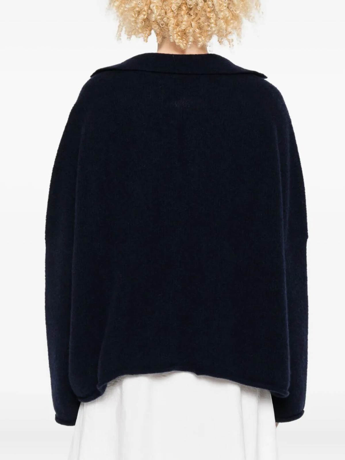 Cuello alto azul, mangas 3/4, dobladillo recto
