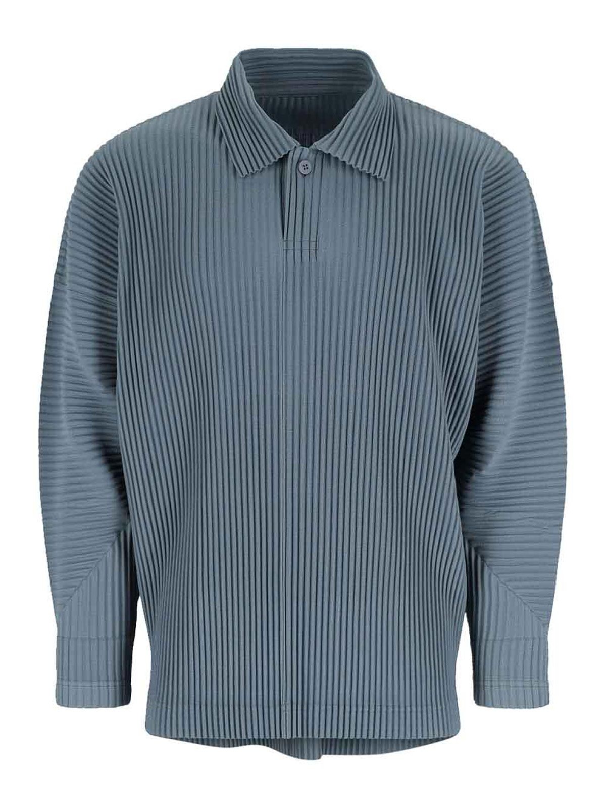 Polo plisado para hombre, en tela azul, cuello clásico, cierre con botones, dobladillo recto.