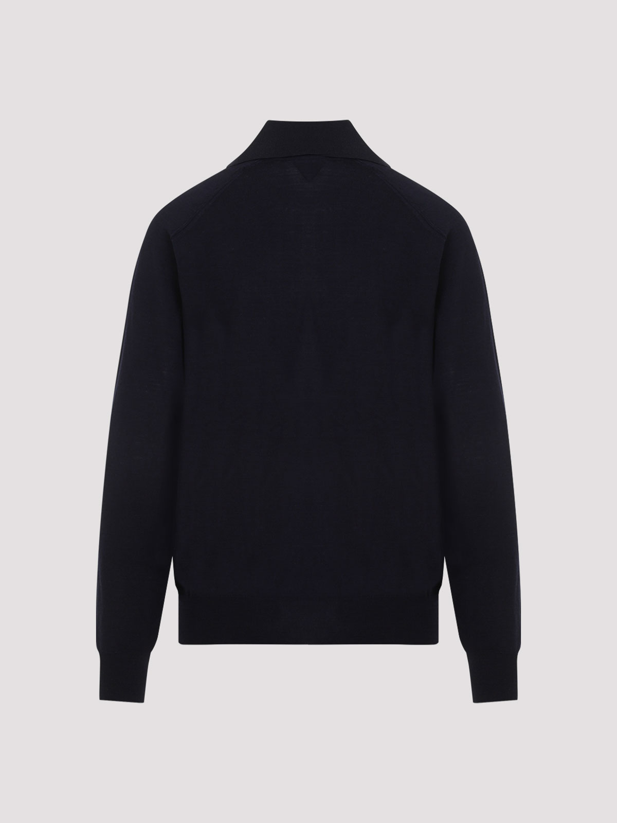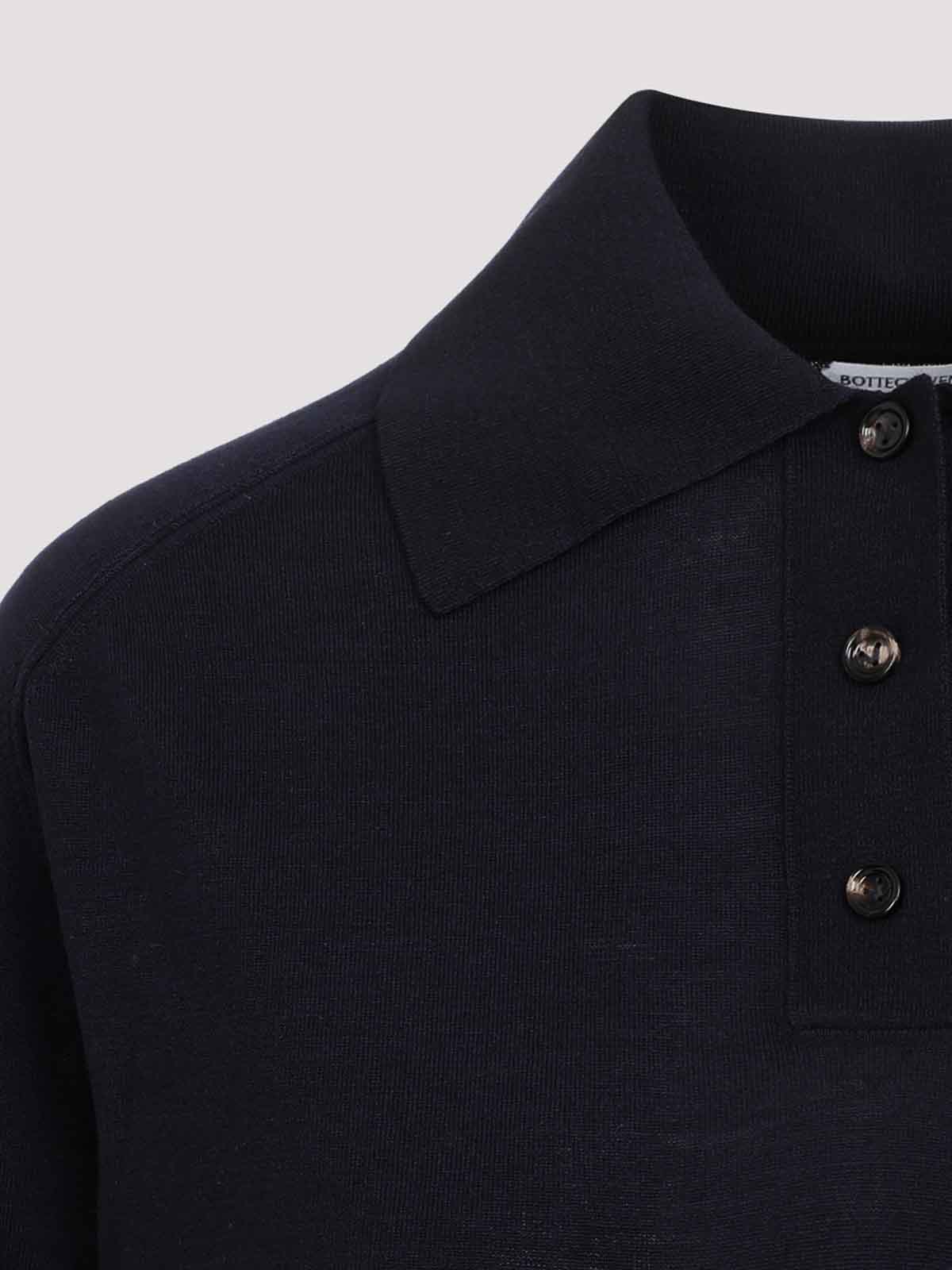 Polo Bottega veneta de lana azul marino de manga larga. Polo de pura lana azul marino. Cuello polo clásico, costuras tonales, mangas largas, puños acanalados, dobladillo recto.
