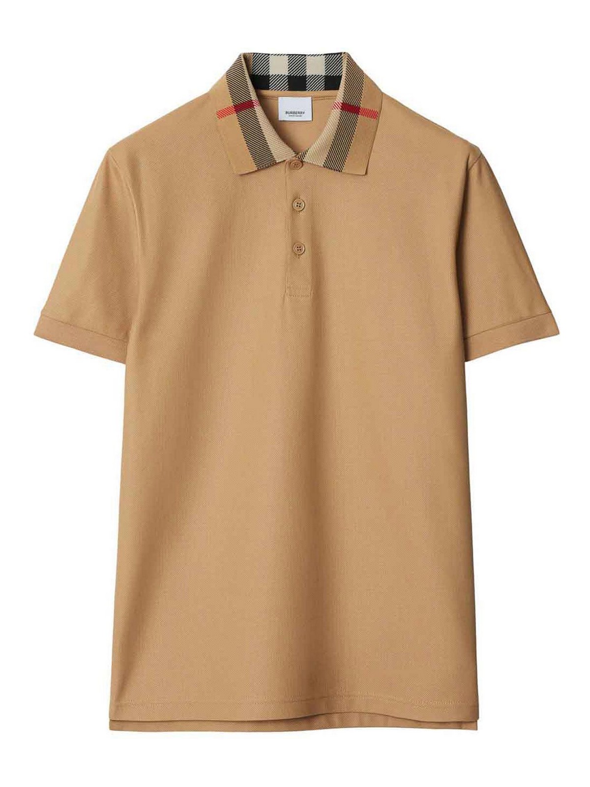 Cuello polo vintage de algodón beige, cuello polo, botones en la parte delantera, manga corta, dobladillo recto, aberturas laterales cortas