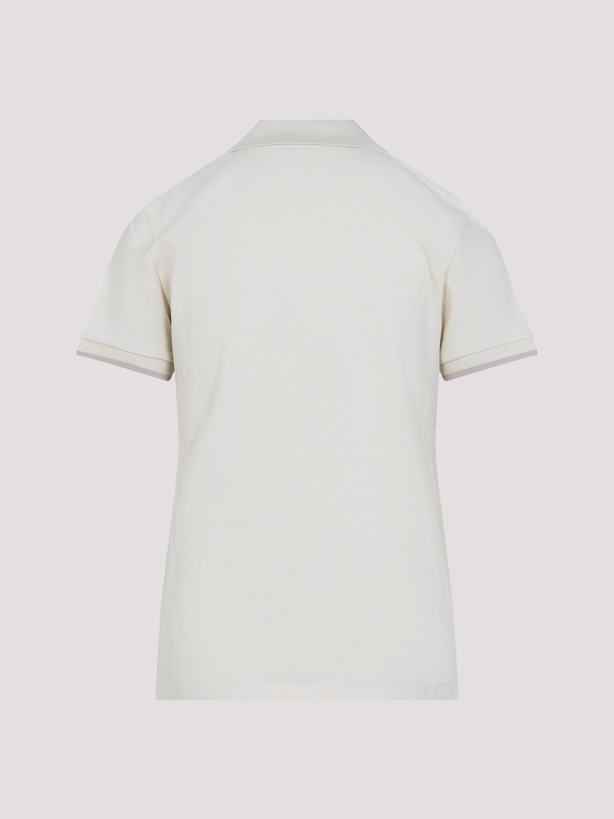 Polo Moncler de algodón beige. Polo de corte regular confeccionado en piqué de algodón de color beige claro, con cuello puntiagudo, cierre con botones a presión en la parte delantera, parche con el logotipo en el pecho, mangas cortas con detalles a rayas y dobladillo recto.