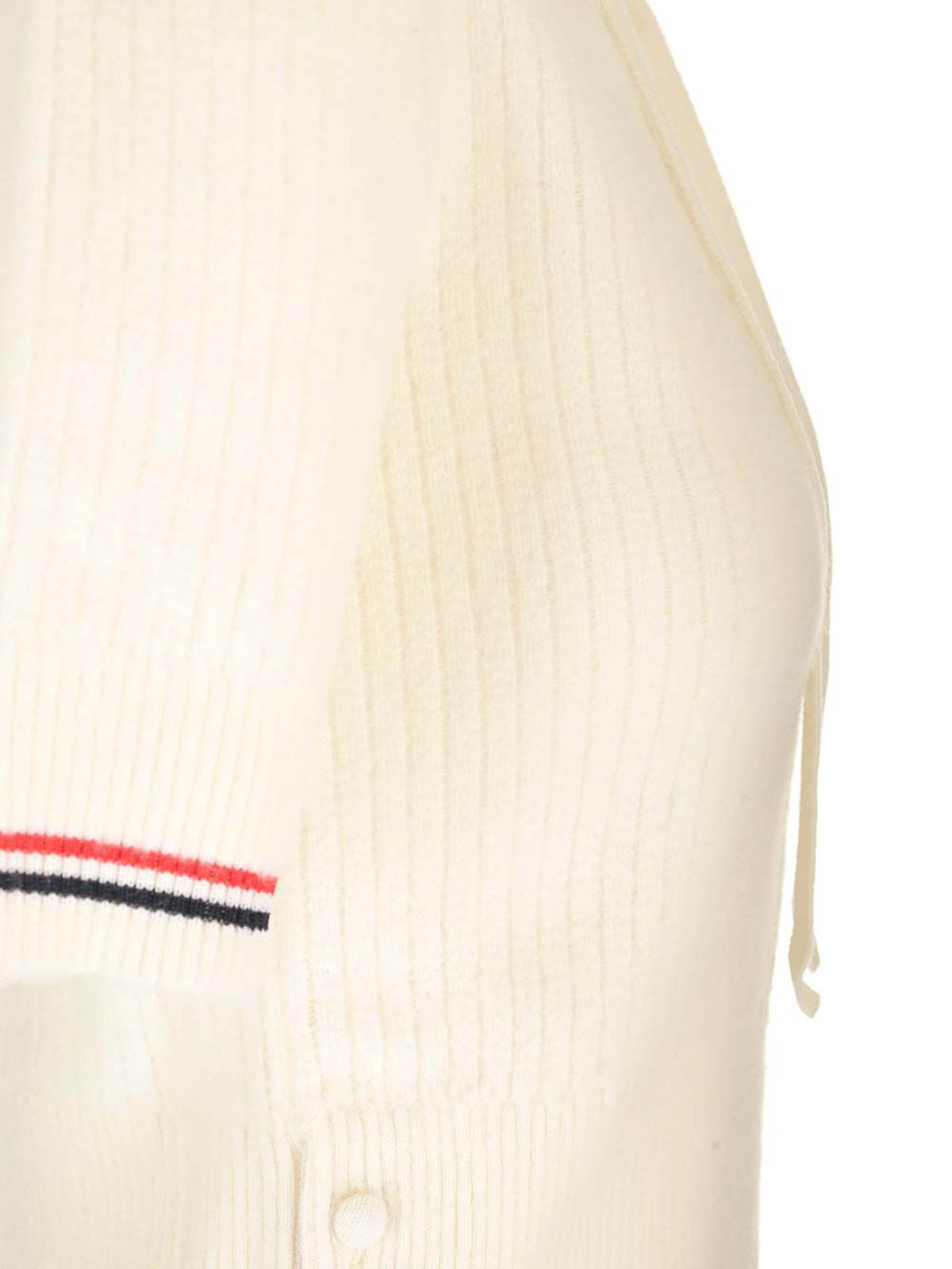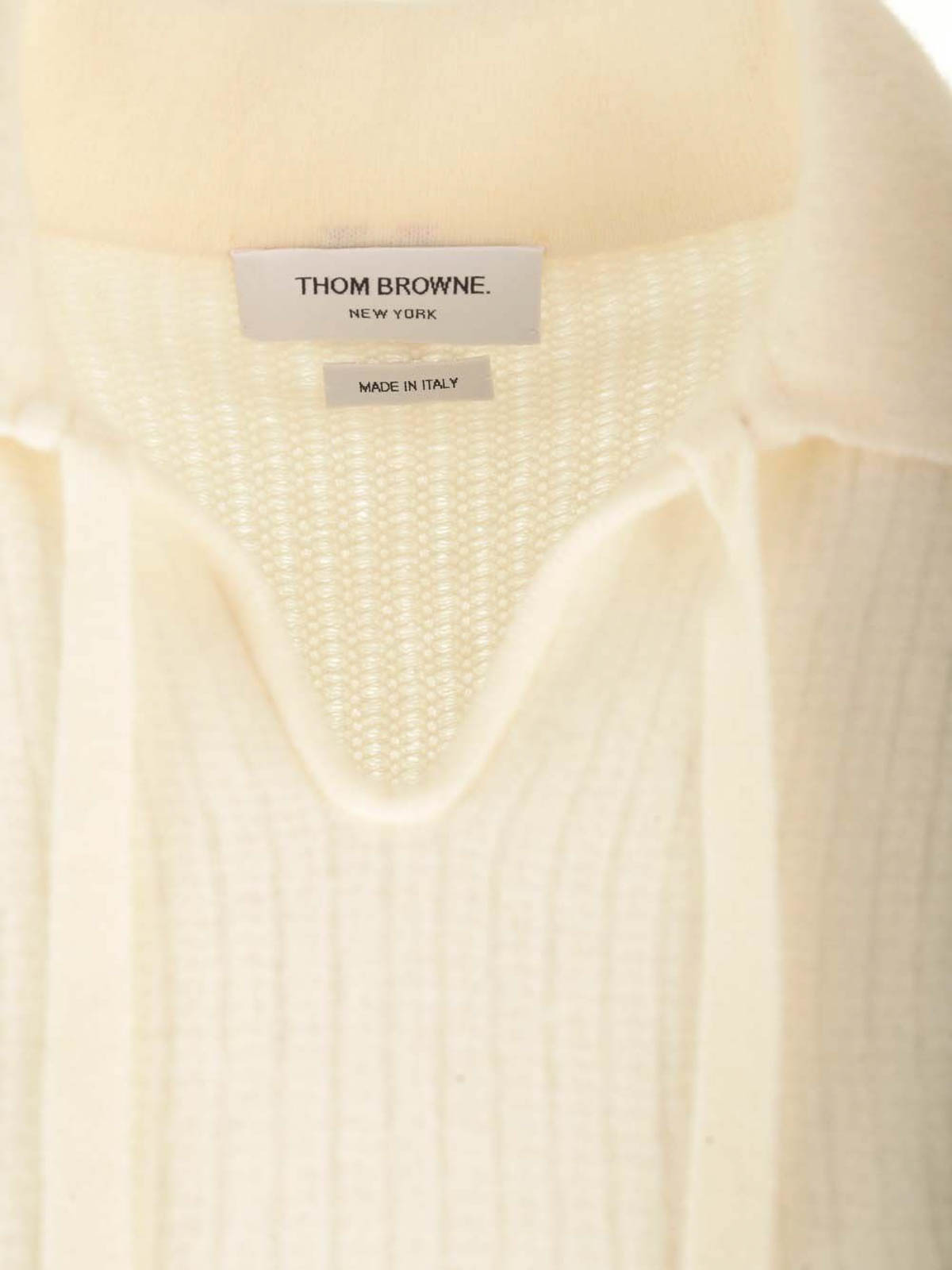 Polo blanco de lana merino cepillada de Thom Browne, con pespunte en forma de ojo de cerradura, aberturas laterales abotonadas, ribete de grogrén a rayas y lengüeta con lazo de grogrén a rayas.