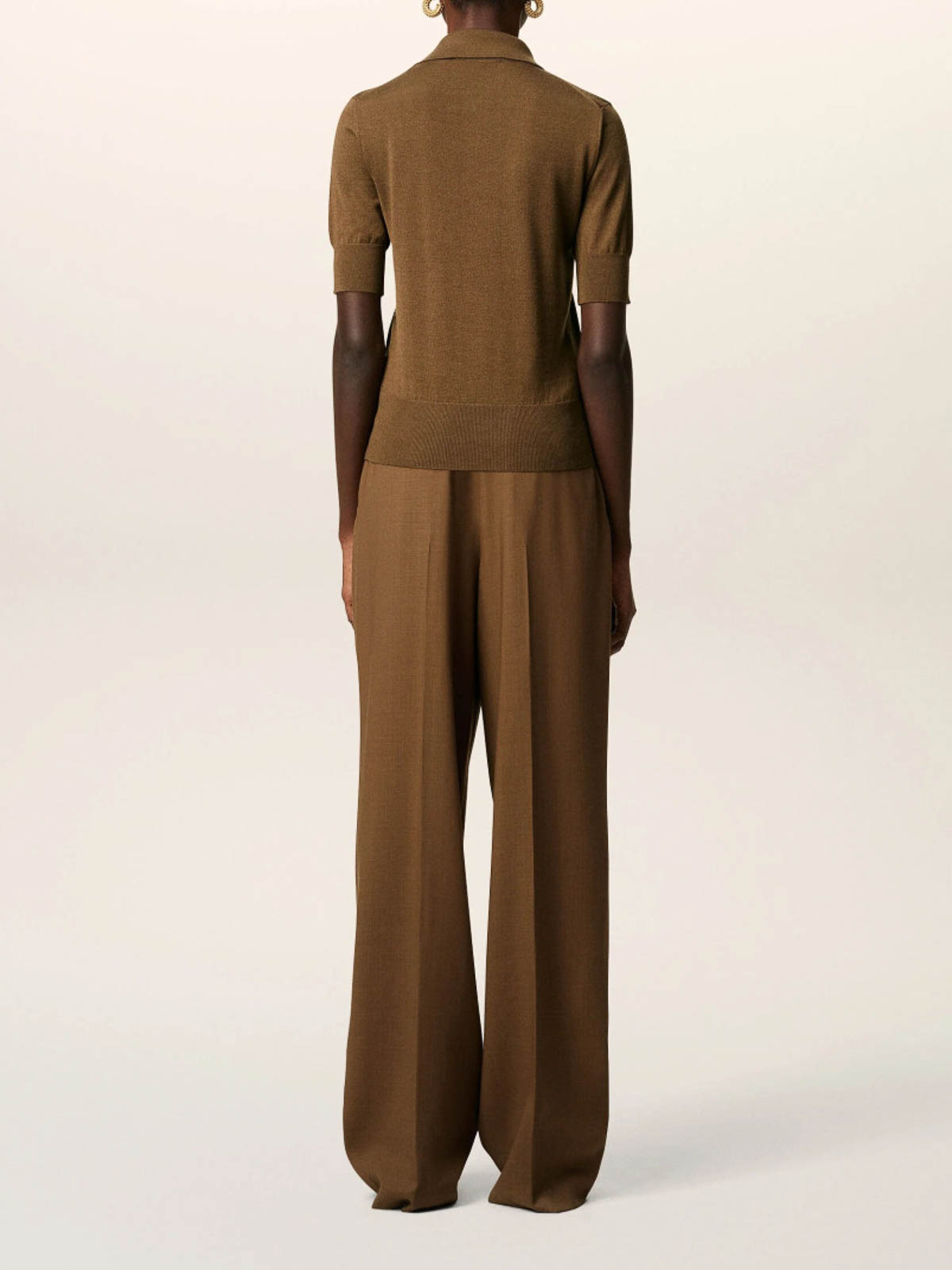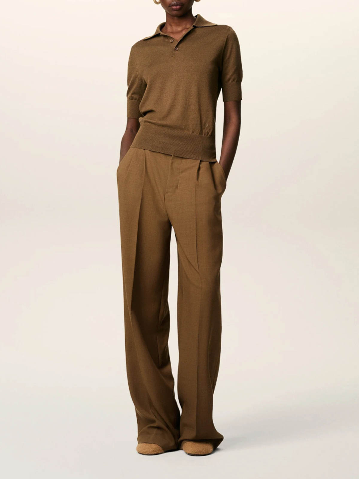color del diseñador: avellana, mezcla de lana virgen y seda, tapeta con botones en la parte delantera, logotipo en forma de corazón bordado del ami de coeur, cuello polo, mangas cortas.