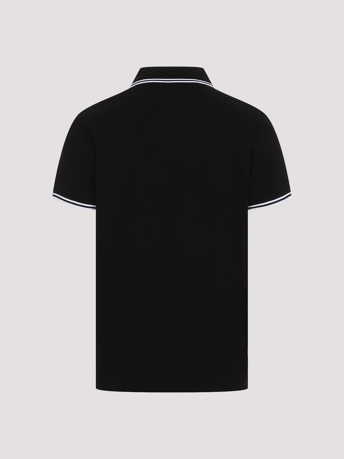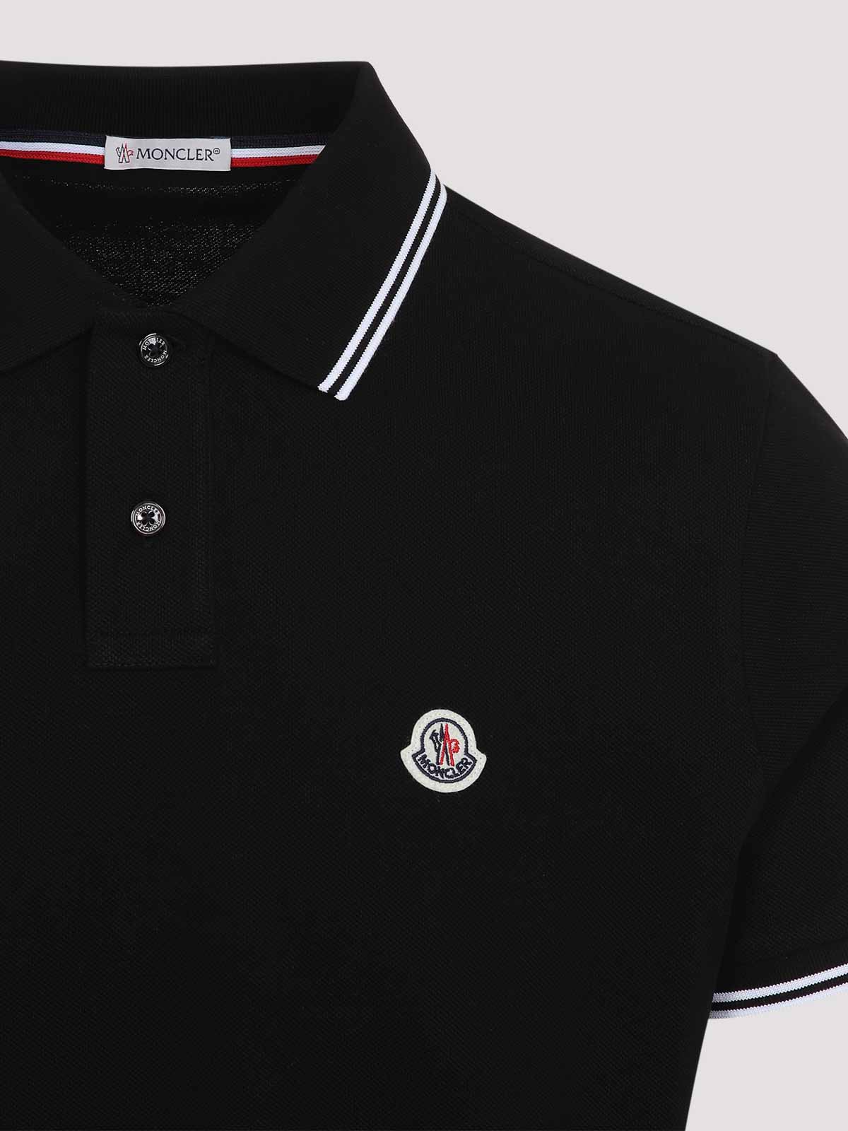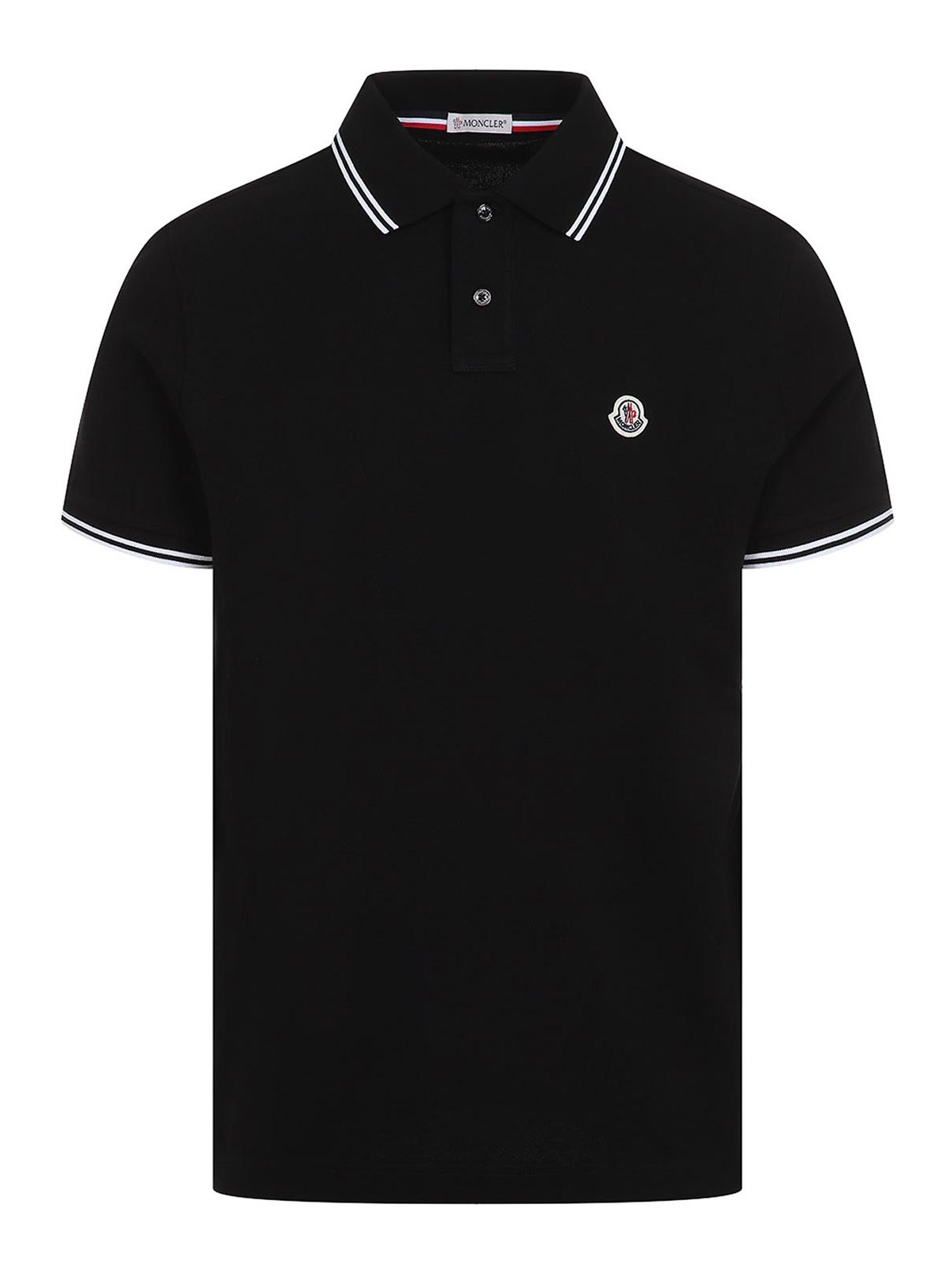 Polo Moncler de manga corta de algodón negro. Polo de algodón negro puro, cuello polo clásico, logotipo de parche en el pecho, manga corta, dobladillo recto, costuras tonales. Detalles de rayas blancas en el cuello y los ribetes.