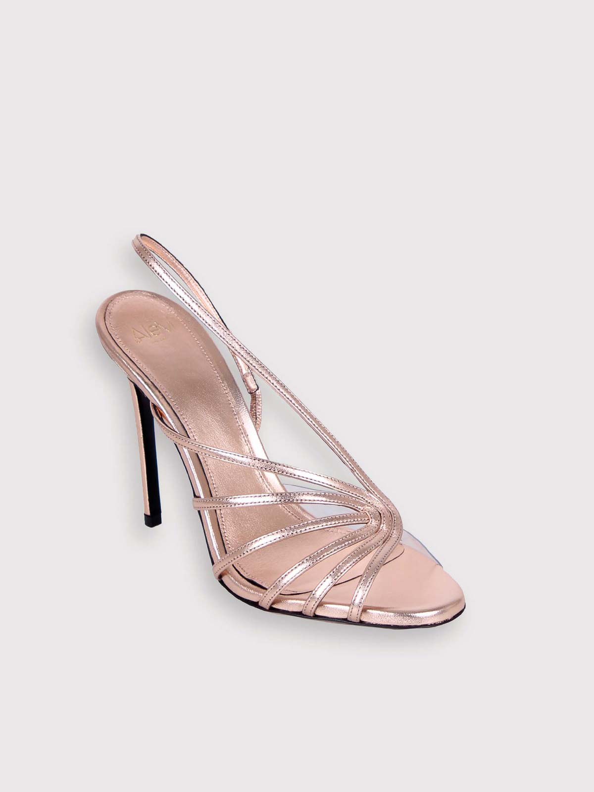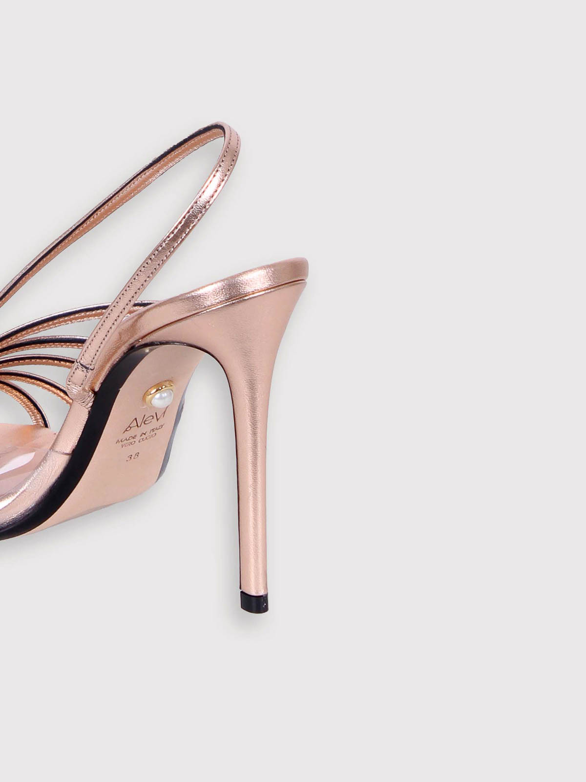Sandalia Sand con Alevi: combinación perfecta entre estilo sofisticado y feminidad para dar un toque atrevido a tus looks de noche u ocasiones especiales. Hecha en laminado recortado con listas asimétricas, parte superior transparente en el lado de tacón de aguja con perla decorativa