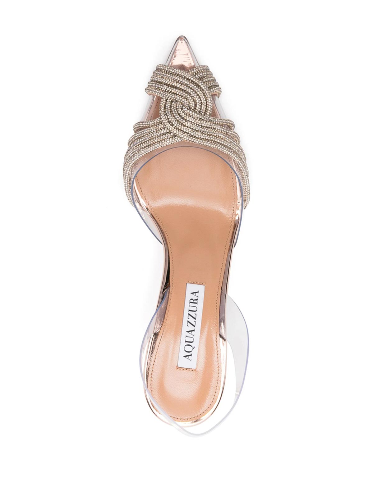 Adorno dorado, puntera abierta, puntera puntiaguda, correa destalonada, correa destalonada de la marca en mm de altura, tacón de aguja sin cordones, estilo