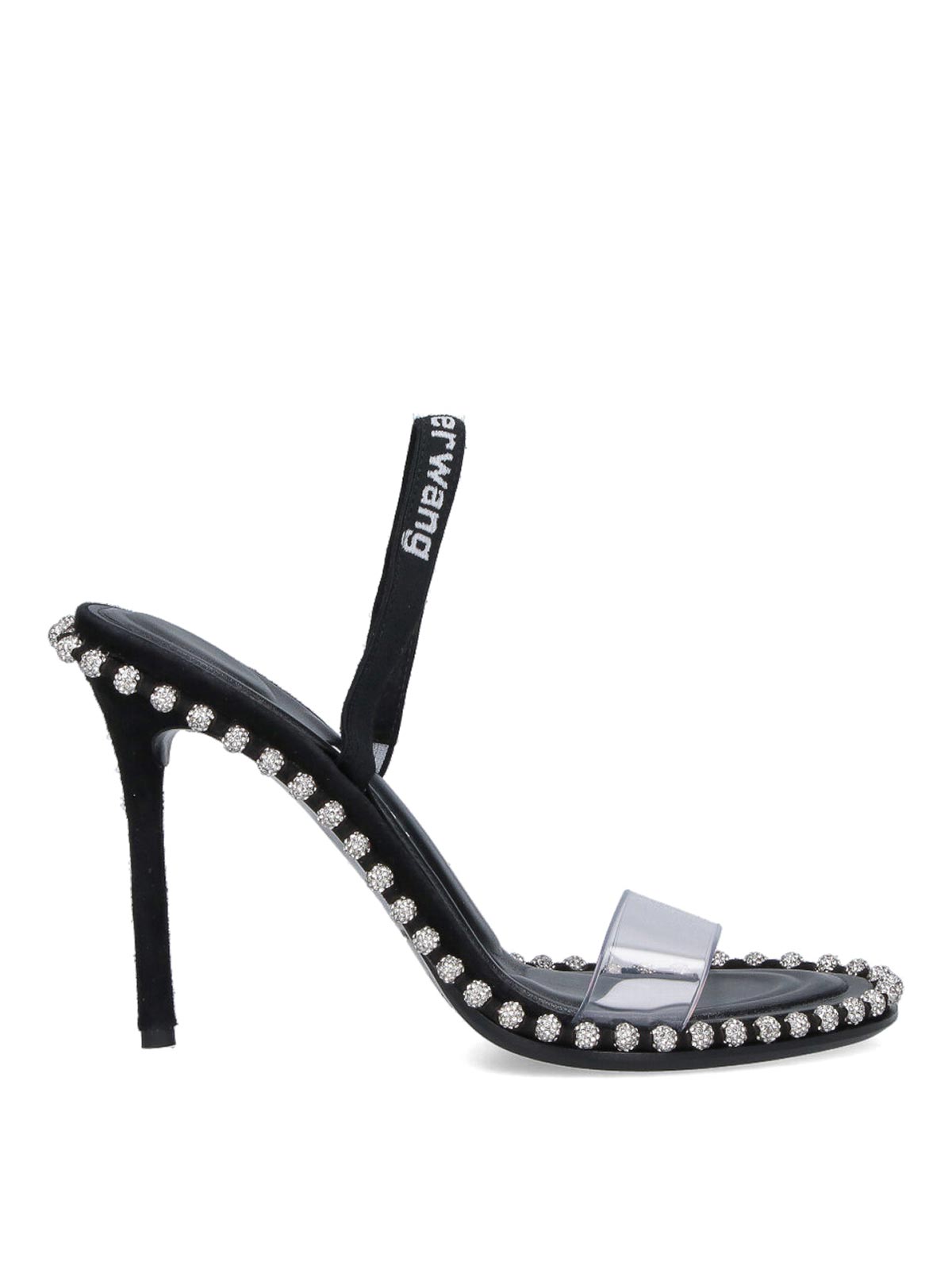Sandalias Alexander Wang Nova con strass, de tela negra, punta redonda, banda de PVC en la parte superior, correa elástica, detalle de logotipo en contraste, corte sin cordones, suela de piel.