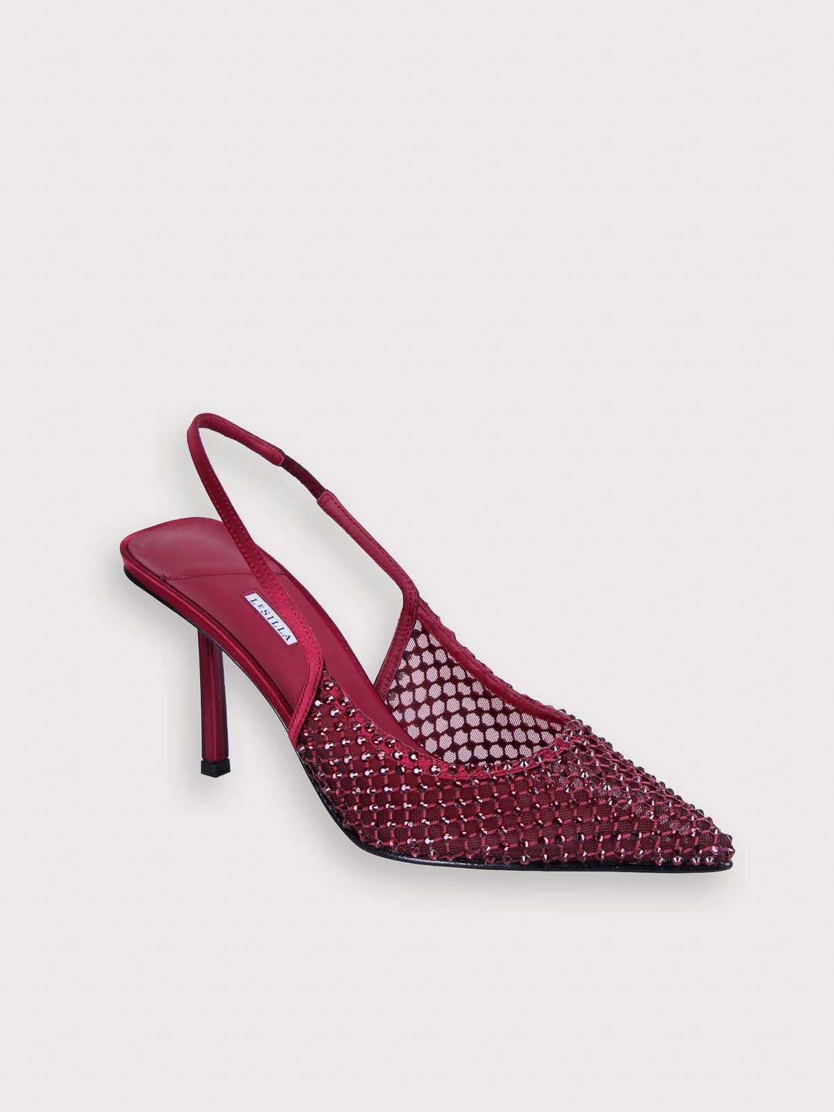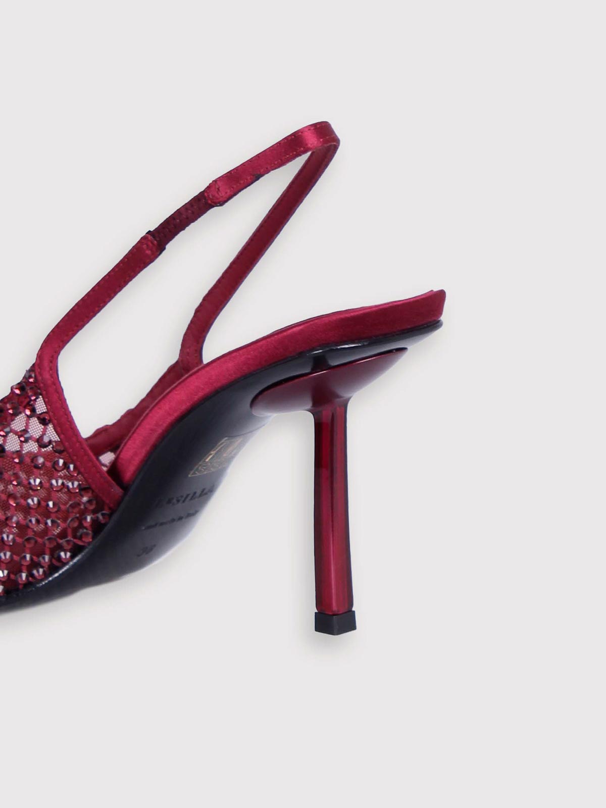 SlingBack Gilda de Le Sille, ideal para noches especiales o eventos inolvidables, para aquellos que quieren destacar con luz, elegancia y sostenibilidad en la planta superior, sobre la red transparente, con correa de punta cónica con partes elásticas, acabados en satén estilete.