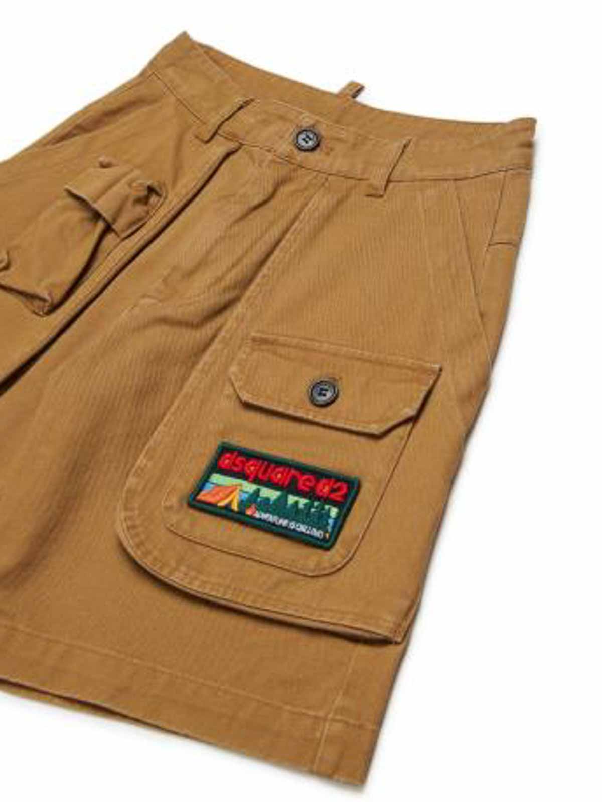 Bermudas con detalle de parche con logo marrón claro, cierre con botones, múltiples bolsillos, trabillas para cinturón, bolsillos traseros