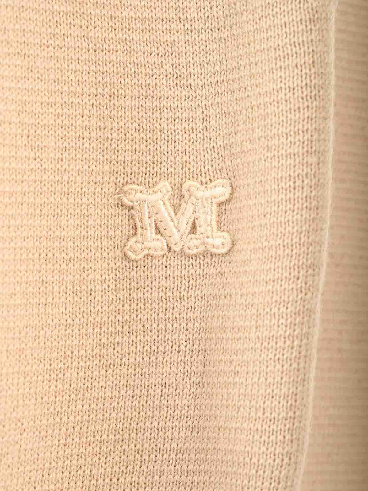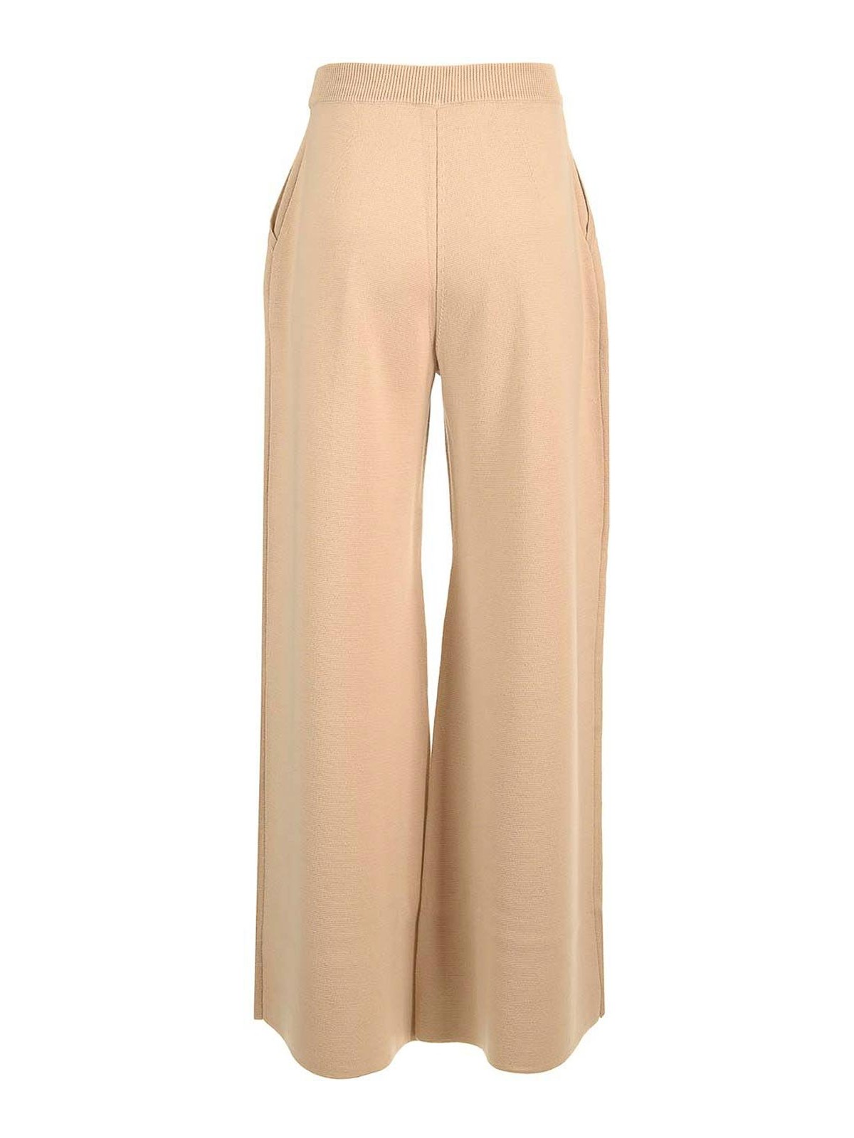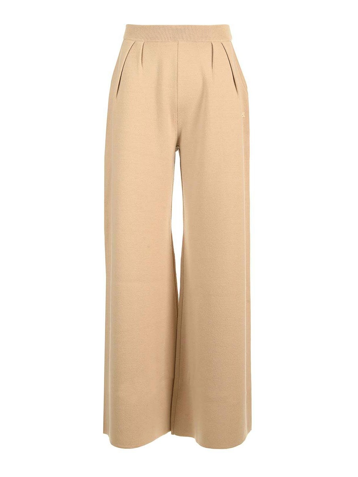 Hilo de lana pura fina de color beige, confeccionado en pantalones de punto de tela beige de max mara con pernera ancha, pliegues dobles en la parte delantera y cintura elástica acanalada. Acabado con bolsillos franceses en los laterales y detalle del monograma M en hilo sobre tono, aplicado en el lado izquierdo usado.