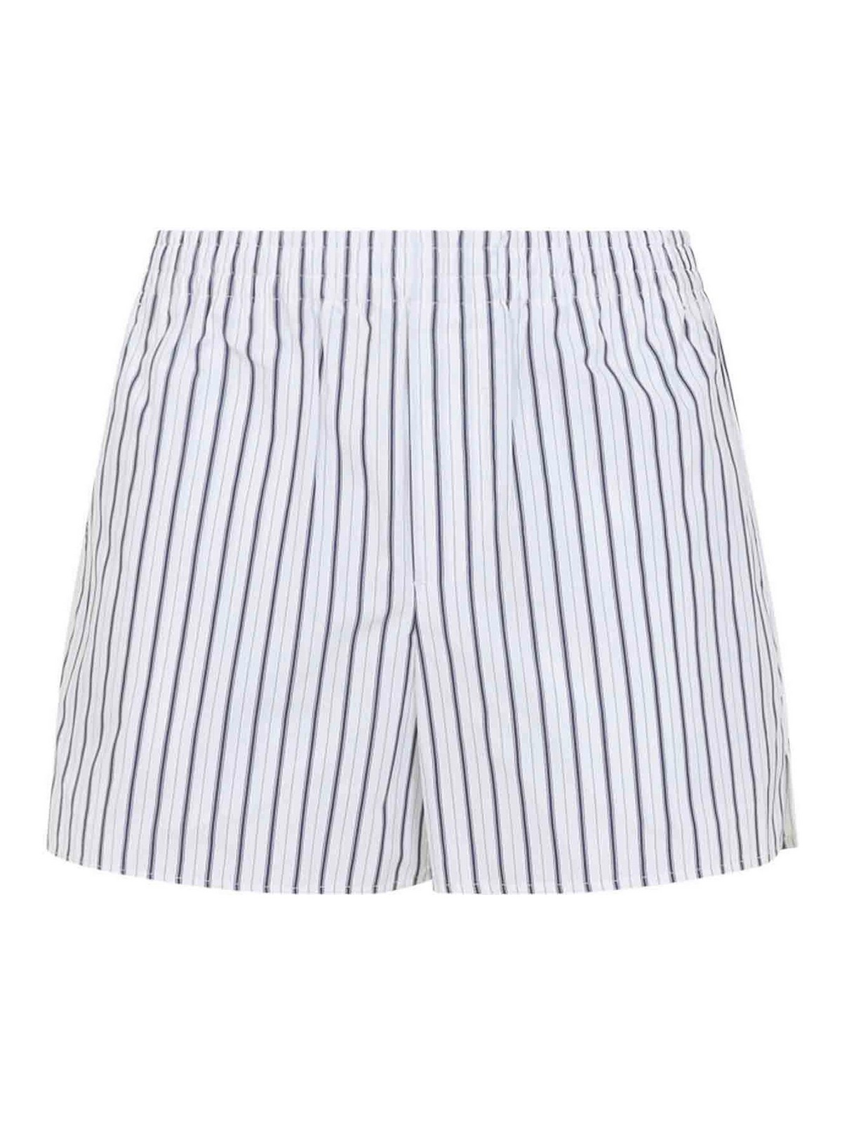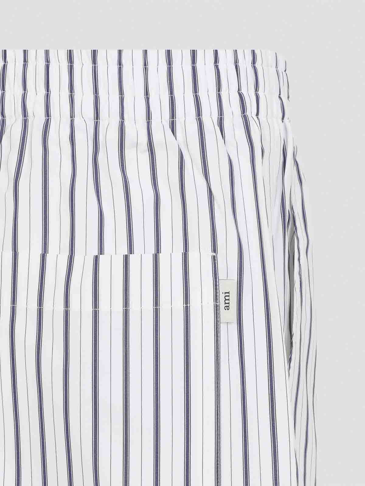 Pantalones cortos Ami de algodón azul elástico. Pantalones cortos de corte casual confeccionados en algodón a rayas azules y blancas, con cintura elástica, cierre con cremallera oculta en la parte delantera, bolsillos laterales, bolsillo de parche con una pequeña etiqueta de la marca en la parte posterior, aberturas laterales y dobladillo recto.