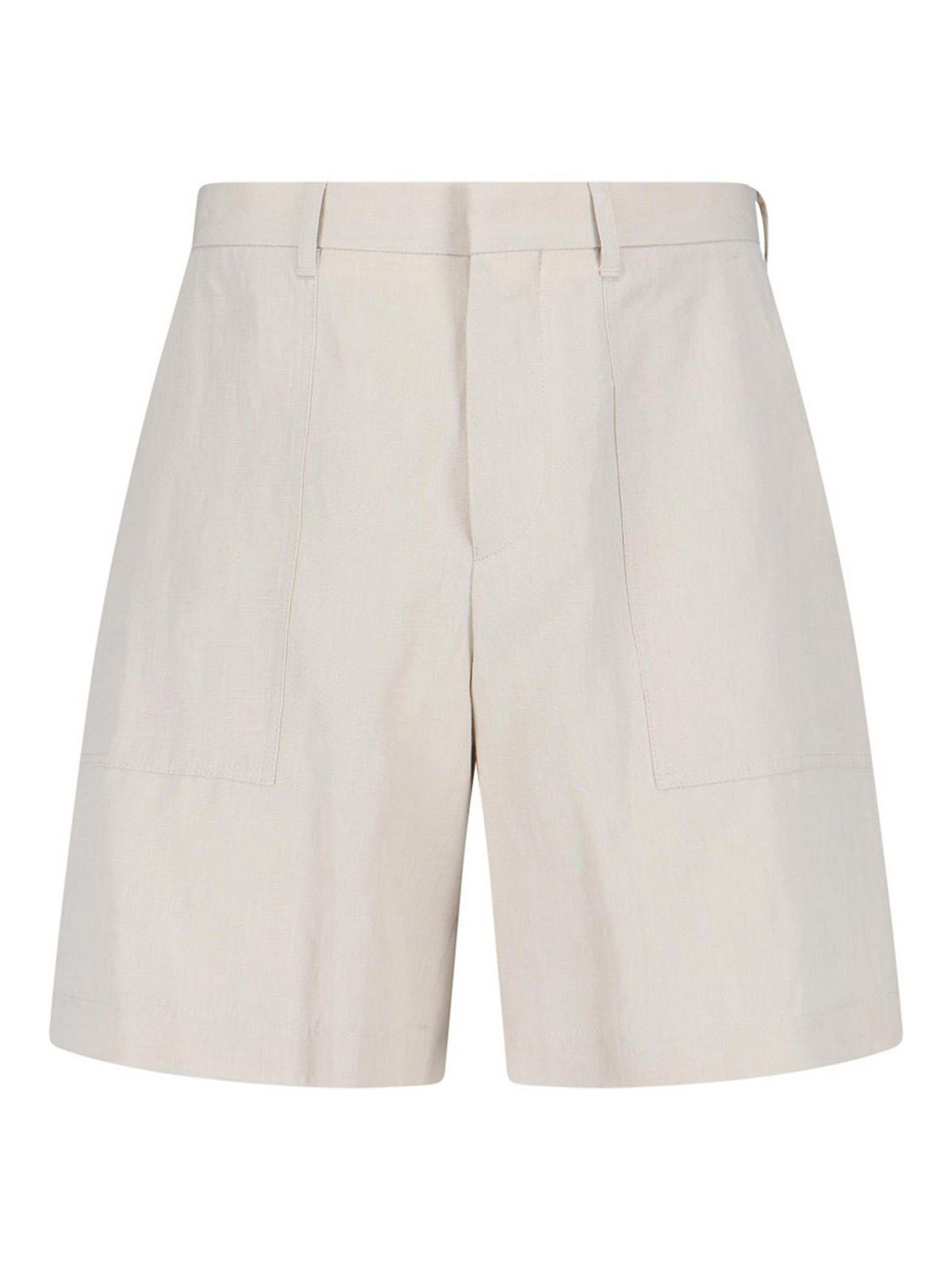 Pantalones cortos a medida Lardini en mezcla de lino y algodón color crema, cintura media, cierre con cremallera y gancho, trabillas para cinturón, dos bolsillos laterales, dos bolsillos traseros ribeteados con botones, pernera recta.