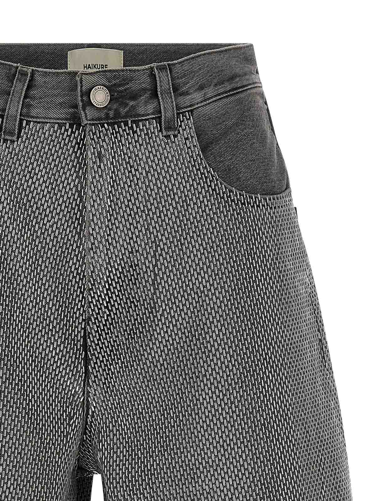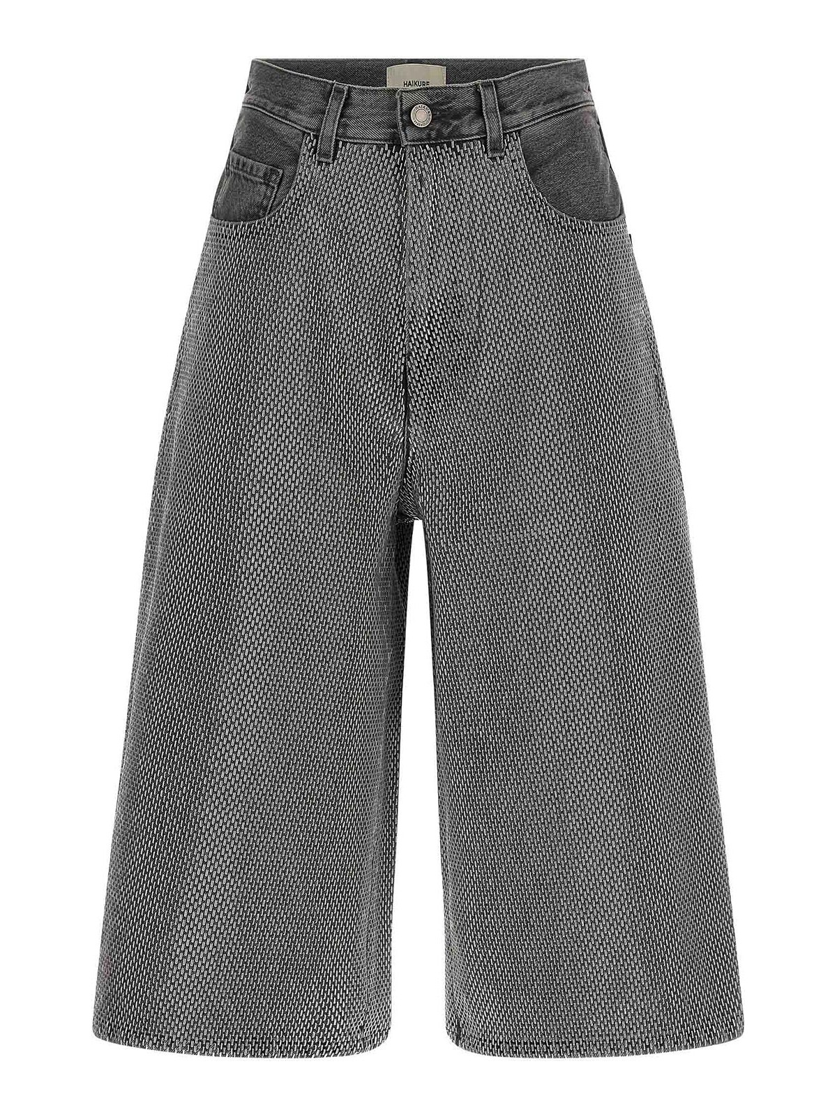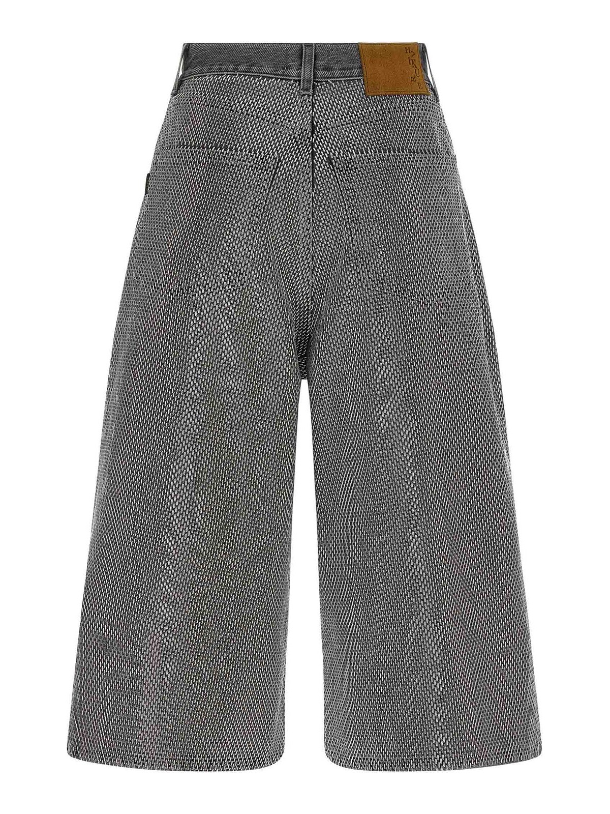 Bermudas de mezclilla de algodón Belle' con tachuelas baguette en toda la prenda, pernera ancha, cierre frontal con cremallera y botón, cinco bolsillos, etiqueta con el logotipo de gamuza en la parte trasera.