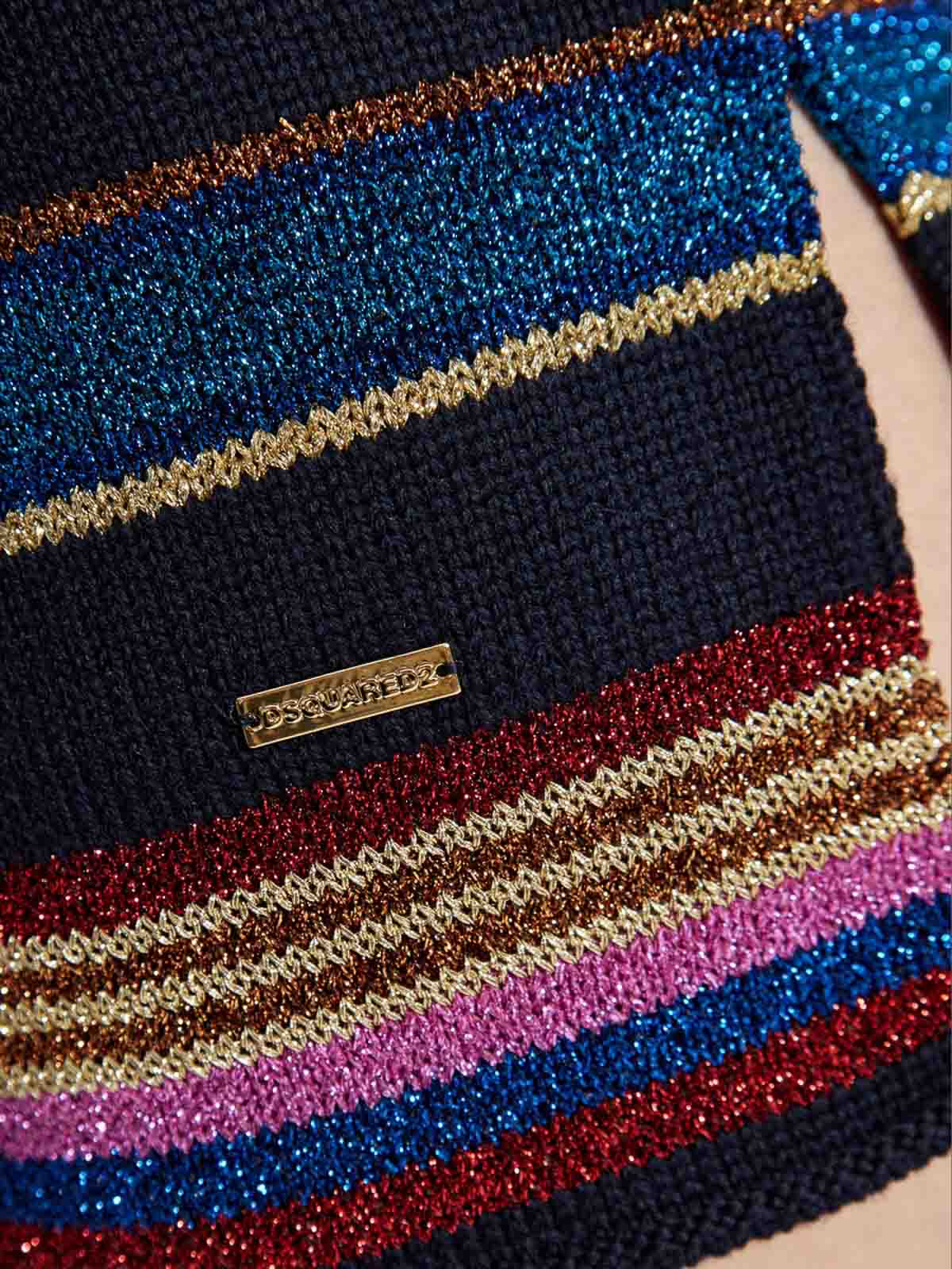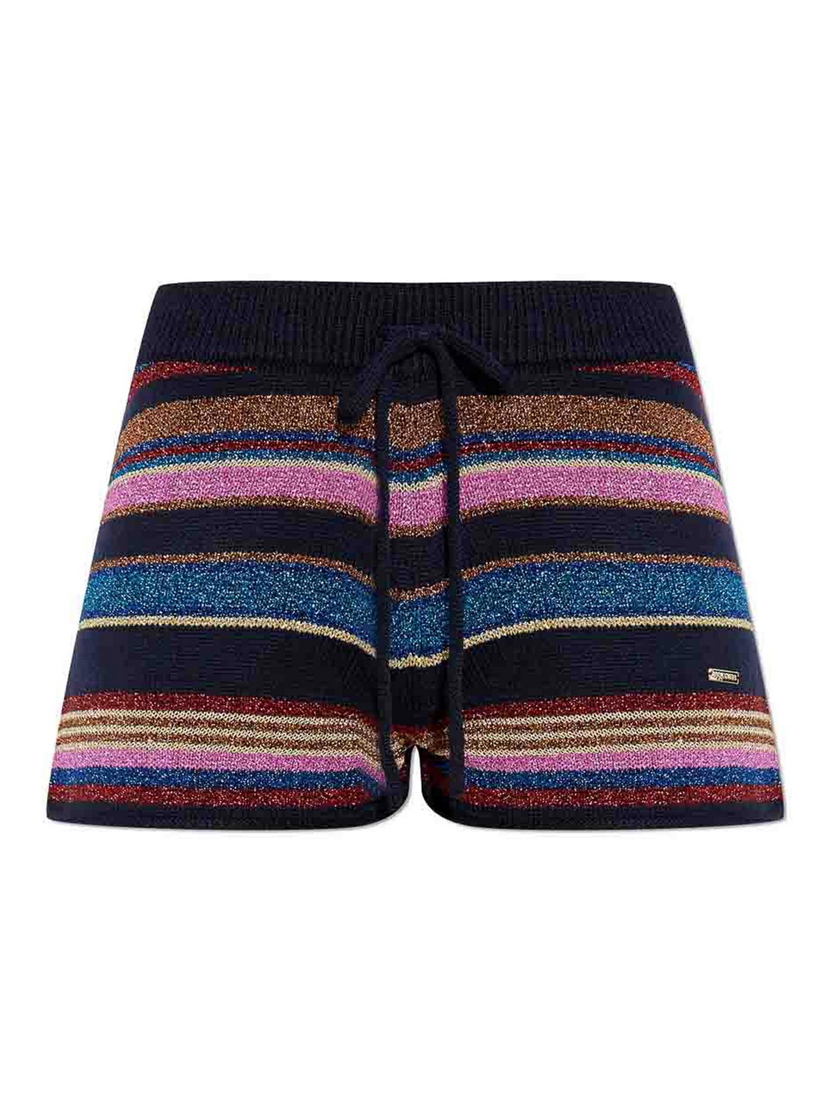 Pantalones cortos multicolores Dsquared2 con hilo de lúrex, el corte simple y ligeramente ajustado acentúa suavemente la silueta, mientras que la cintura alta con cordón ajustable permite un ajuste perfecto, con un patrón de rayas horizontales en tonos metálicos saturados,