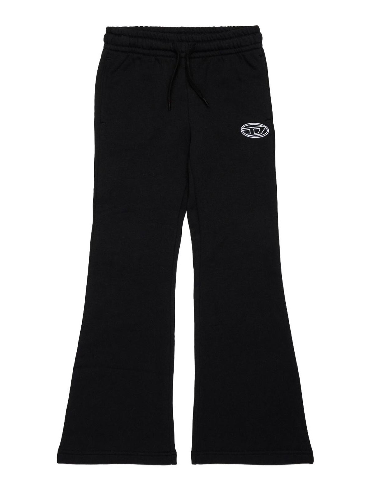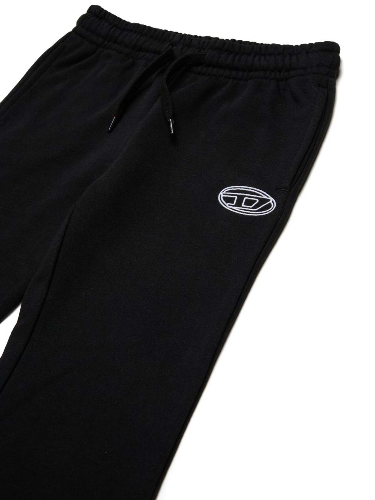 Pantalones acampanados de algodón negros de diesel kids con cordón en la cintura, logotipo bordado en la parte delantera y dos bolsillos laterales ribeteados, diesel kids, pantalones acampanados, negros, algodón, logotipo bordado, dos bolsillos laterales ribeteados