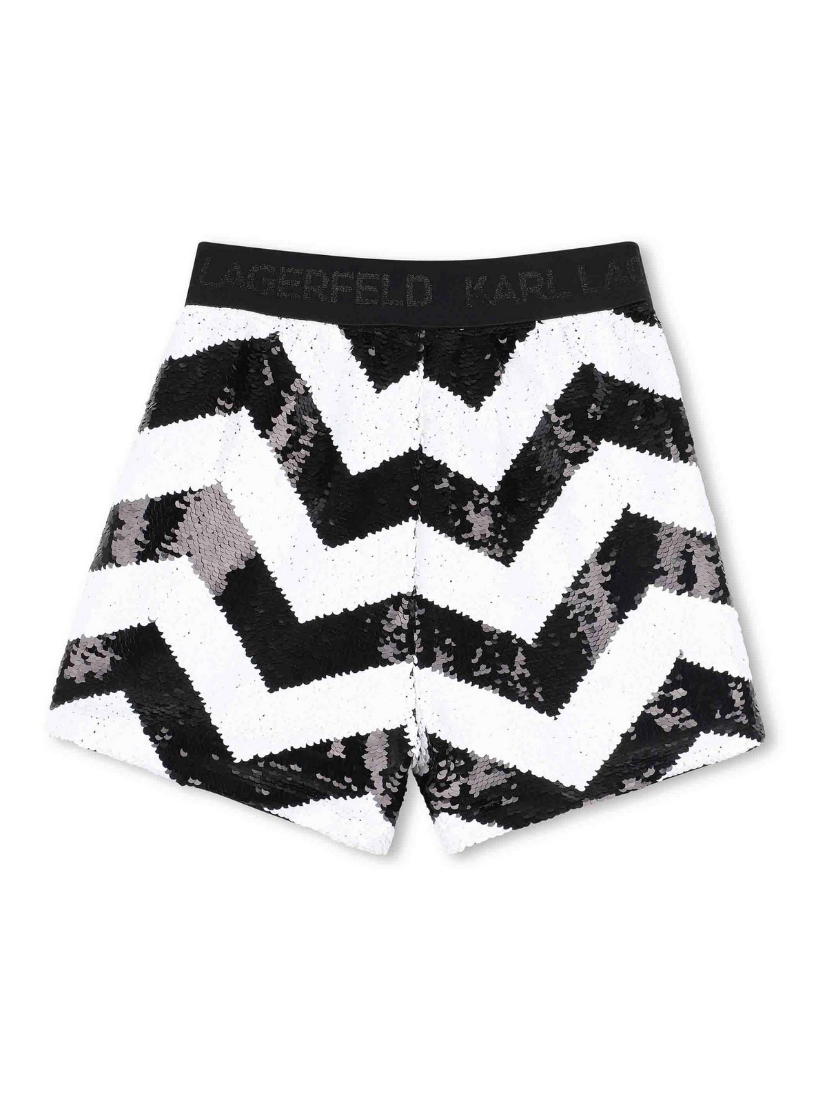 Pantalones cortos con lentejuelas blancas y negras, motivo de chevron, cintura elástica, todas las lentejuelas, sobre lentejuelas