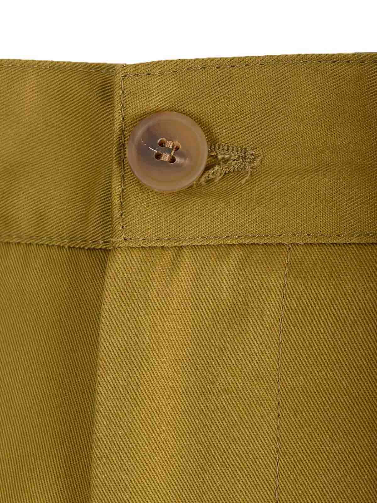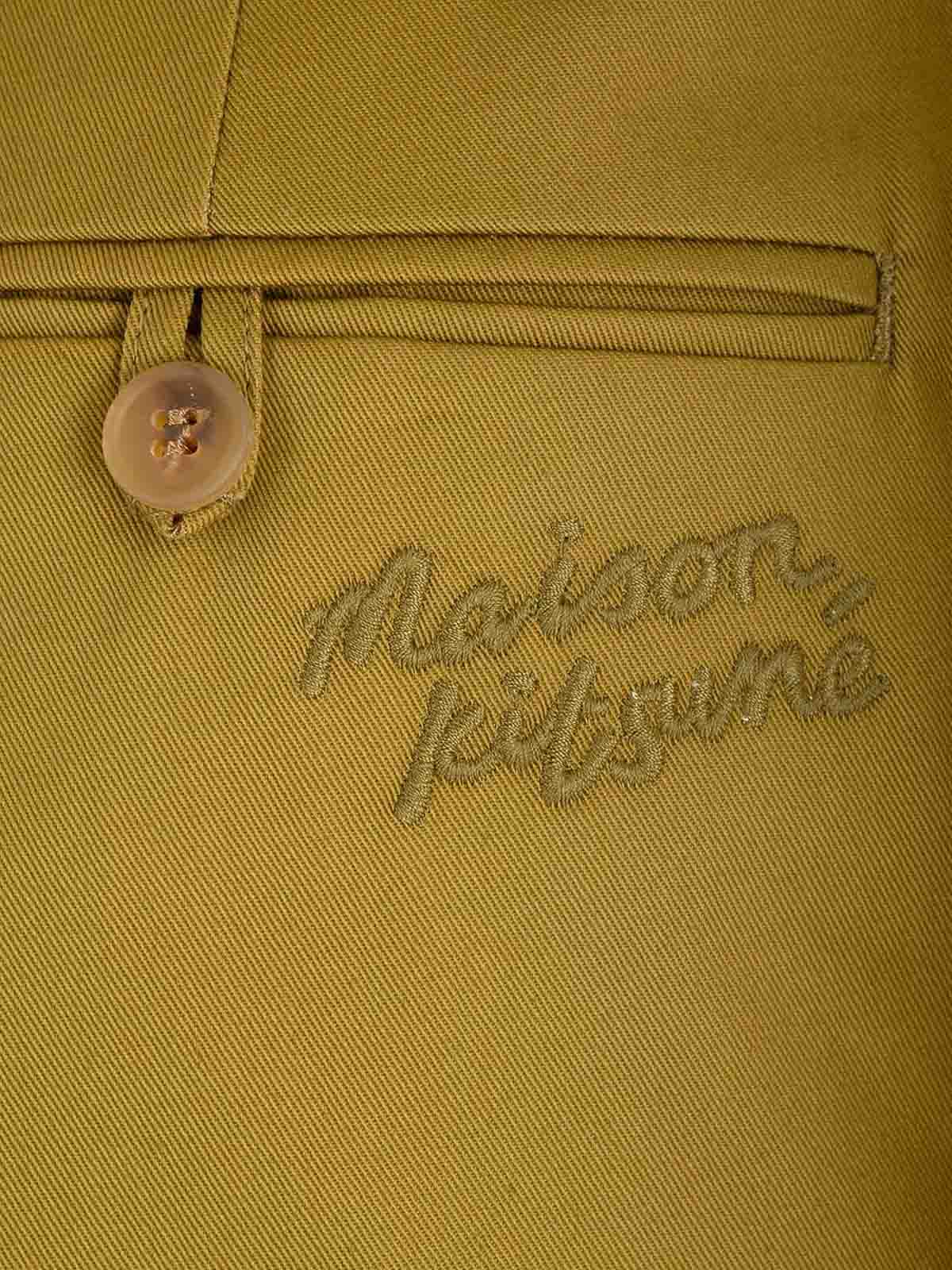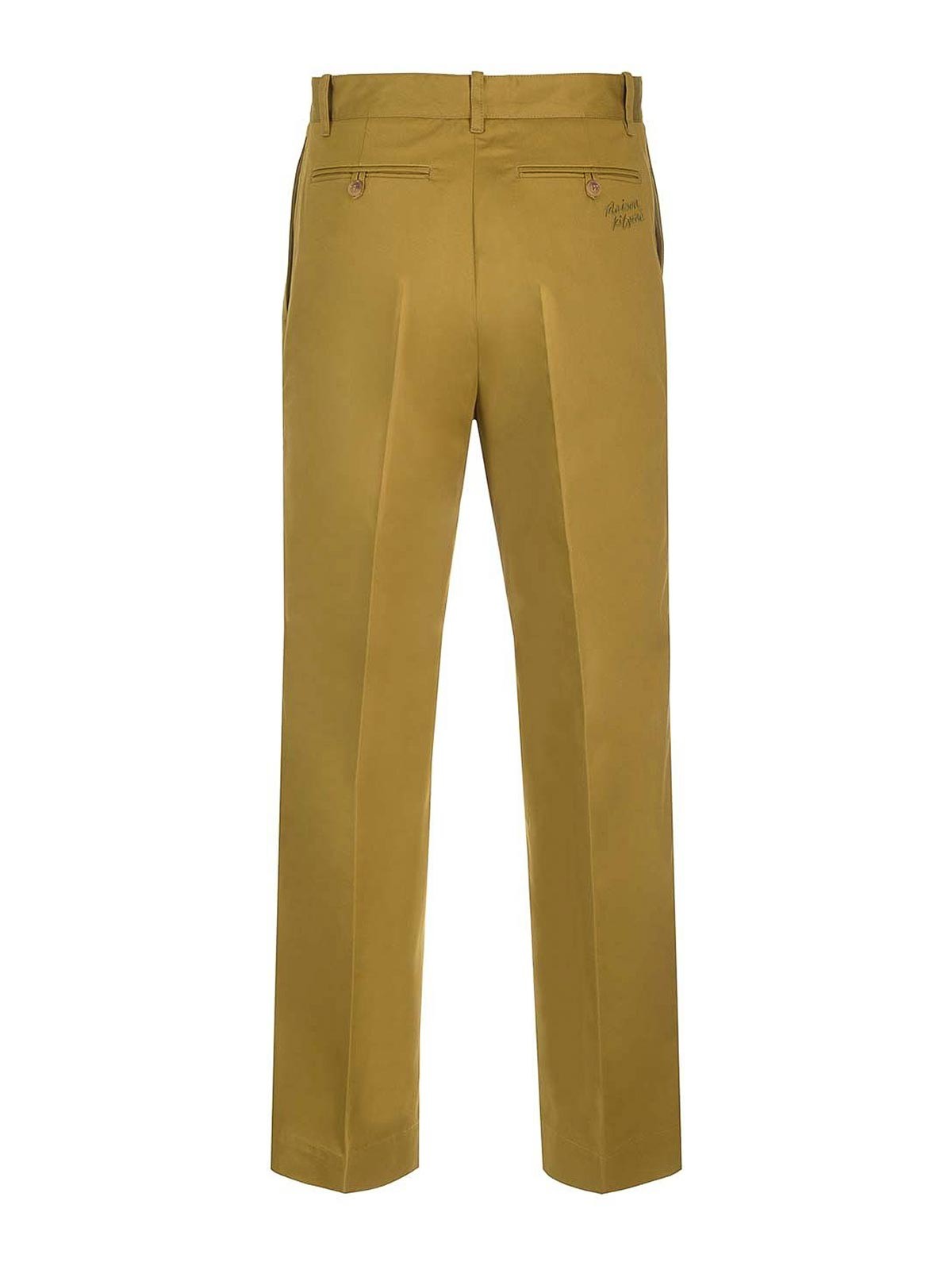 Pantalones chinos de maison kitsun en algodón verde podrido, con corte holgado, pernera recta, logotipo bordado en la espalda en el mismo tono, cierre con cremallera y botón ocultos, bolsillos.