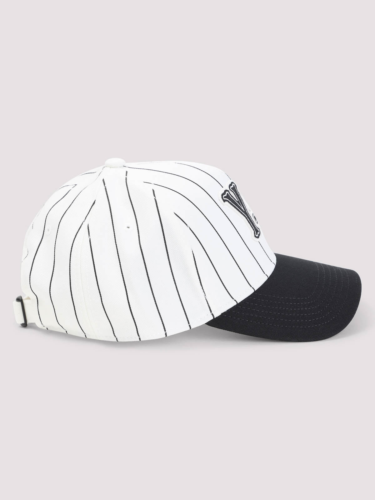 Gorra tipo pinstri para mascotas de color beige Y-3. Gorra para mascotas de color beige puro, construcción de seis paneles, fondo beige con detalles de rayas negras, logotipo característico en negro en la parte delantera, visera negra en contraste y correa trasera ajustable.