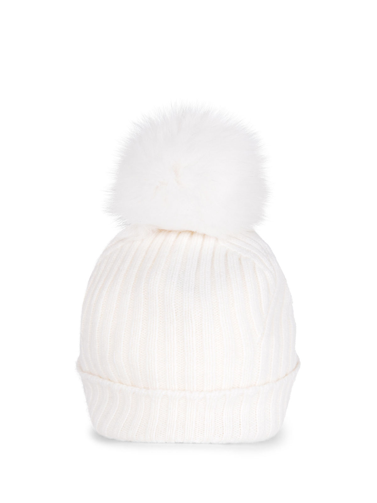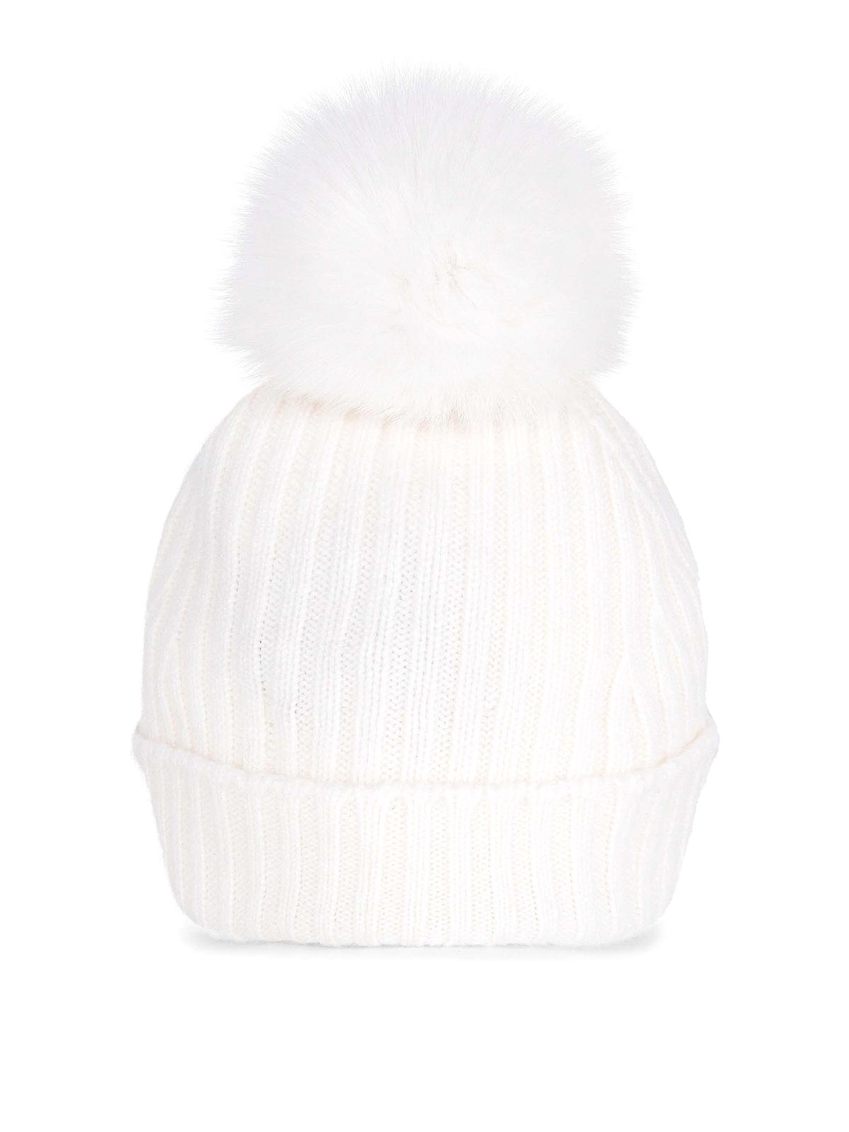 Gorro Vanise de cachemir blanco, acanalado, pompón de zorro tono sobre tono, 100% cachemir fabricado en Italia