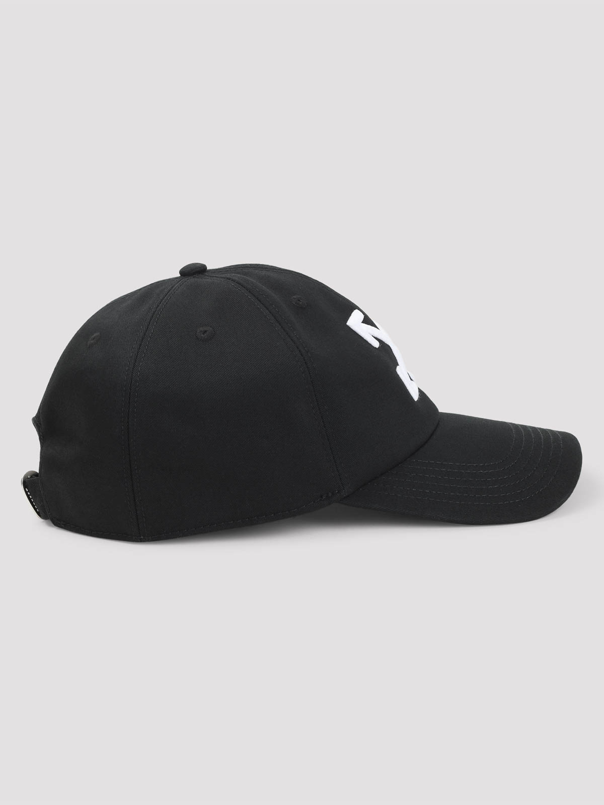 Gorra de béisbol con forma de flecha negra en blanco roto, algodón negro, confección de 6 paneles, visera tonal. Logotipo de flecha en la parte delantera en blanco contrastante, correa ajustable en la parte trasera.
