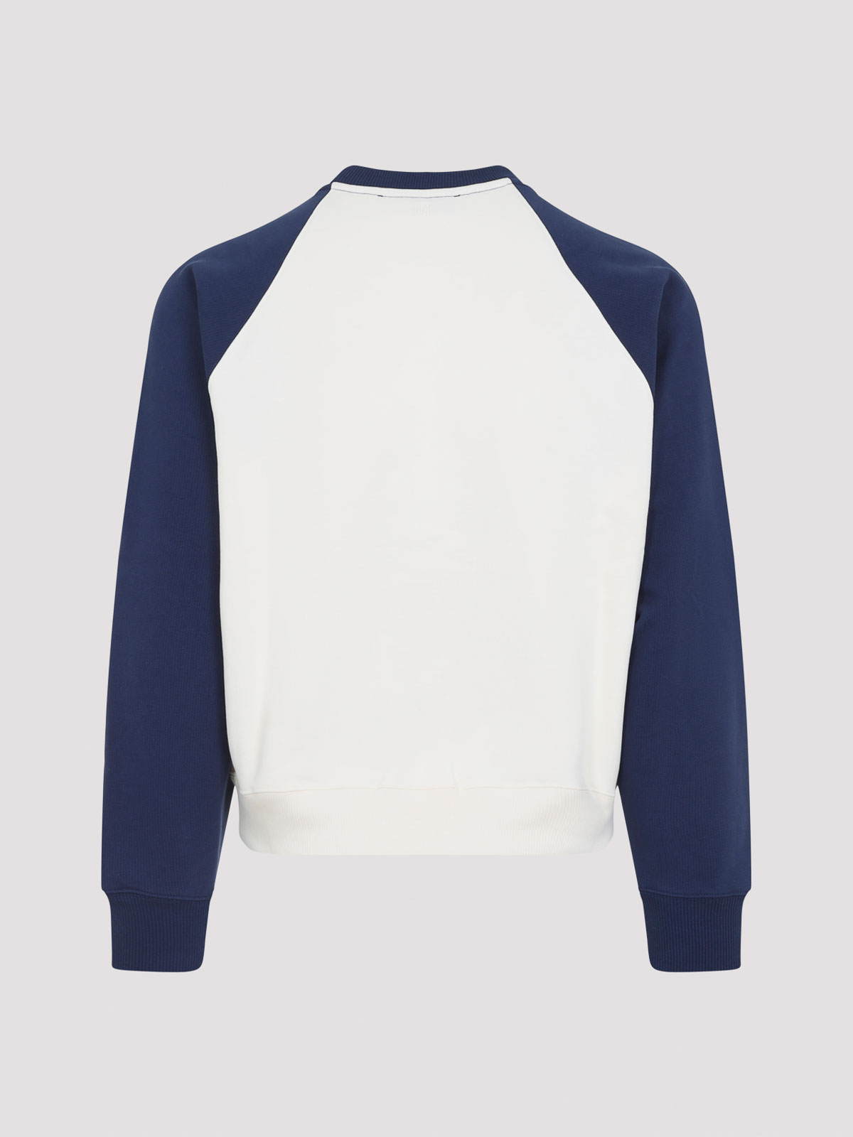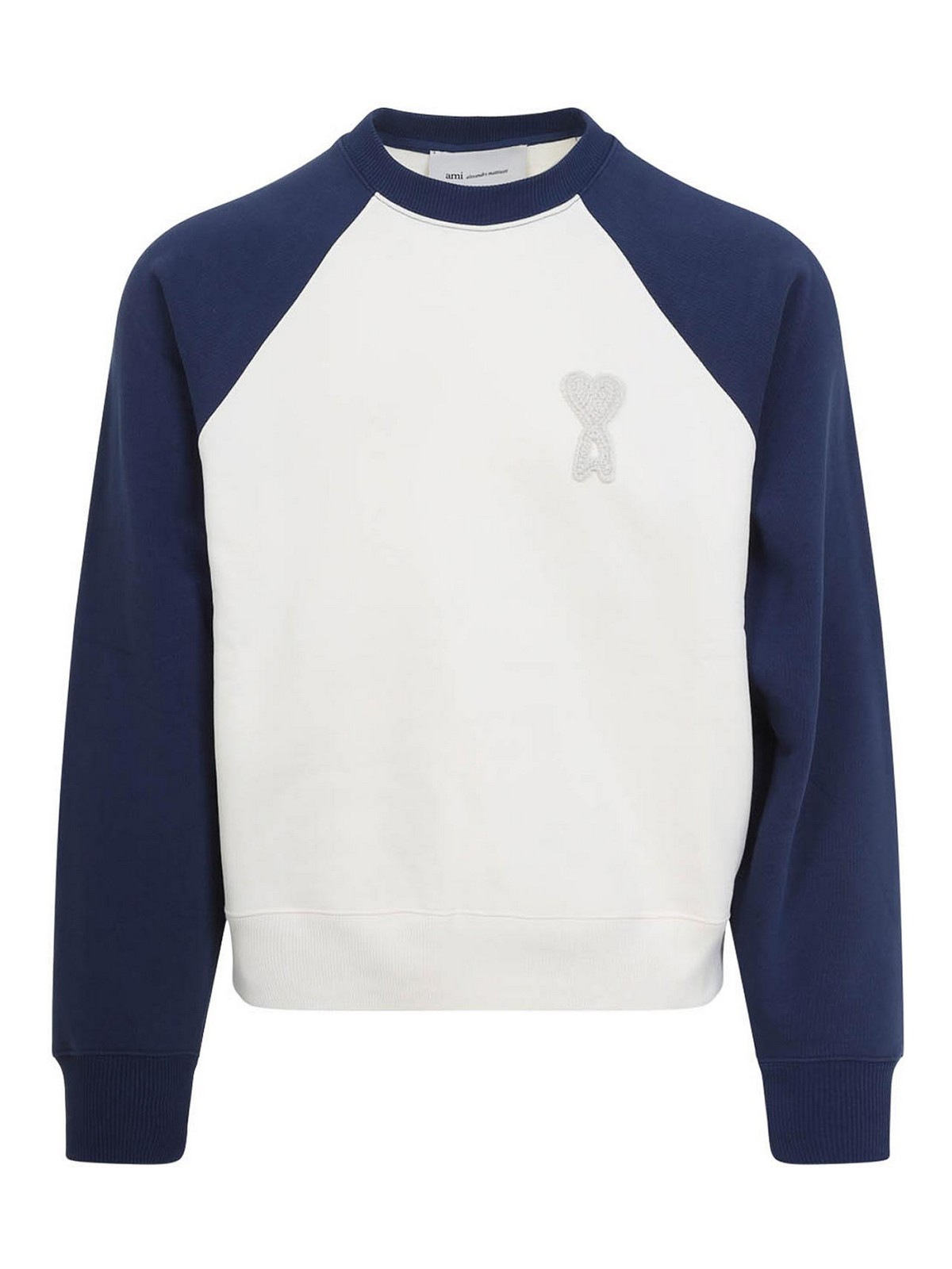 Sudadera Ami de algodón blanco y azul de corte cuadrado. Sudadera bicolor confeccionada con forro polar de algodón blanco y azul, con cuello redondo, un parche con el logotipo tejido a ganchillo en el pecho, mangas raglán largas, bordes acanalados y corte cuadrado.