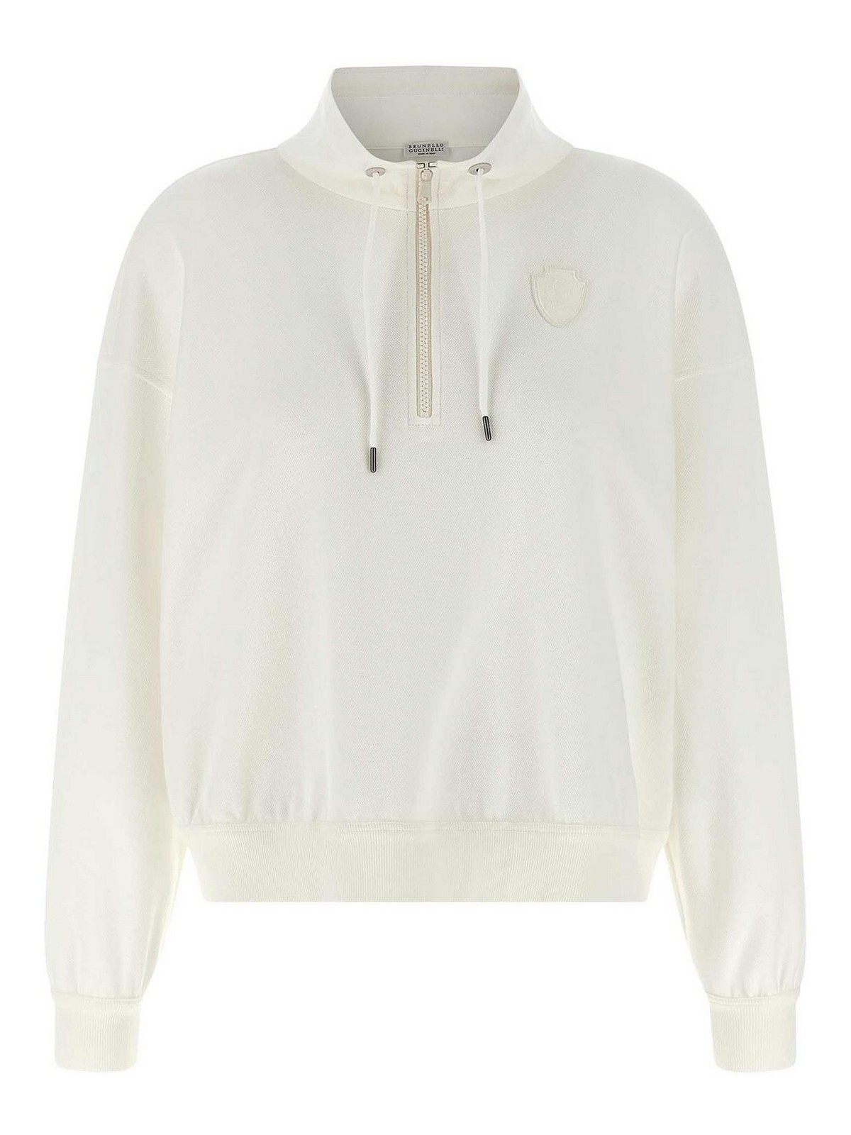 Sudadera de algodón piqué con detalles acanalados de algodón elástico, parche heráldico solomeo en la parte delantera, cuello tipo cráter, media cremallera, manga larga con puños y hombros caídos, banda en el dobladillo.